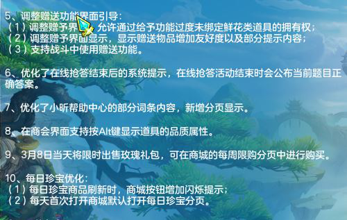 刚背兽解读:赠送功能界面的改动 第一点改动是最关键的,鲜花可以通过给予功能交给别人了,不会直接增加好友度。(赠送增加好友度) 以后可以放心的给朋友丢小花了。 第二点改动细化给予和赠与界面,赠与界面可以赠送增加好友度的物品如小花、珍珠。其他物品则只能通过给予功能给予好友。 第三点战斗中可以使用赠送功能,这个改动其实是换汤不换药!因为以前的好友窗口赠送在战斗中也能赠送鲜花。