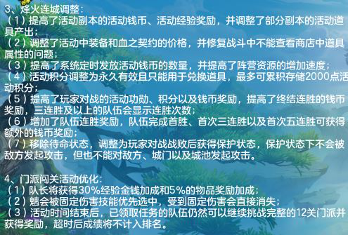 刚背兽解读:烽火连城活动的调整 第一点改动全方位提高活动中的活动钱币、活动经验奖励、增加活动道具产出。目的十分清晰:加快烽火的节奏,钱来的快更快买装备武装自己,经验来得快更早达到PK等级。 第二点调整契约(召唤兽)和装备价格,同第一点还是加快活动进程。因为上周改动以后出现了很多烽火刷城没刷完的局,所以策划这周把活动进程加快了。 第三点提高定时发放钱币的数量,并提高阵营资源增加速度。同一、二,加快活动进程,让活动更快结束。 第四点积分变为永久有效且只能用于兑换道具,最高存储2000分。这个改动是烽火我看到现在唯一有用的改动吧,其他的一二三点改动无非加快游戏进程,在加快也改变不了烽火是个鸡肋活动的事实。第四点积分永久化对那些打完烽火忘记兑换的玩家是一个不错的福音,不用再像以前那样担心忘记换了积分清空。积分只能兑换道具侧面削弱了一波宠物寿命兑换,提高了珍兽、神兽这种永生BB的存在感(以前积分可以换寿命),同时也宣告了烽火这个活动存在的目的就是让玩家积分换宝图。 下面的五六七点的总结一下就是鼓励玩家PK,提高PK获胜以后的奖励,降低PK失败、活动战斗失败以后的惩罚。 属于增加了烽火的可玩性,没有改动以前刷分流最后的积分肯定高PK流30分左右,这次改动以后双方差不多持平。 烽火的PK对平民、土豪玩家一视同仁,双方站在同一起跑线。对于精通PK的平民玩家不失为一个奴隶痛饮贵族血的好机会。(把土豪玩家追着打) 刚背兽解读:门派闯关的优化 第一点改动参考副本带队的队长奖励,鼓励玩家带队。因为官方也知道神武的玩家是越来越咸鱼了都想着混队,所以提高玩家带队奖励调动玩家积极性。实际上对于带队玩家的奖励并没有什么变化,详情参考副本队长总空车! 第二点改动参考抓鬼活动的固伤秒魅,方便封系玩家安心挂机混队。降低活动难度 第三点改动参考科举的延时性,活动结束以后也能获得奖励只是不计入排名成绩。 总体来说更新了一系列方便玩家的优化,活动更容易上手。