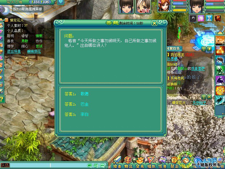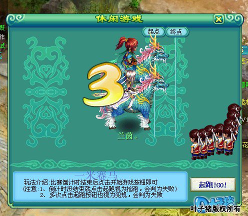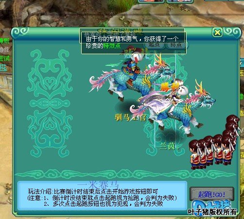 智叟: 这个智叟,每次答题的题目都不一样,时间限制一分钟,速度百度哟。 能获得的个人品质:聪明,博学。(博学需要答对一定数量的题目) 驯马士官:赛马小比赛 点击开始之后,倒数几秒,秒数到立刻点击GO,先到达终点就算完成任务。 (建议到1秒倒数到一半的时候就点起跑,不然等秒数完了再点一般都是输的) |
