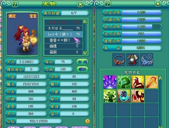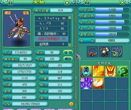 21.新手宠物 小昕萌,小贝帅,葫芦玲珑,吉祥可爱。 这4种新手宠,资质技能都不差,但都是一次性的,不能洗,所以有一只好的新手宠足够屌丝得瑟一阵子了。 个人看法,没有5技能就不要带了,新手宠毕竟是新手宠,到了65总是要换的,不要在新手宠上花费太多精力。 为什么推荐5技能呢?是因为其收藏价值,5技能的新手宠高富帅都不一定能够拥有,当然人家也不一定看得上,见过3000丹洗小昕都没洗出来的。 首推小贝和小昕,技能实用,新区的可以百度小昕小贝礼包,运气好的话出个5技能能让你省掉不少还童丹。 有没有人想过用小昕做血敏宠呢?在不掉生命守护的情况下,回血还是很可观的。个人YY,勿喷。 最后,一个丹洗出来的小昕,屌丝得瑟得瑟。 22.洗宝宝 有个祝福叫做洗宠祝福,祈福出了这个祝福的时候,洗宝宝可能会洗爆资质 但是,经常出现洗龙女爆法功,洗罗刹爆力量的情况 如果你是刘德华的脸,洗出的宝宝绝对给力。如果你是牛大花的脸,擦干眼泪,看看仓库还有多少还童,身上还有多少金币。 23.屌丝的控制宠 剑气,恐怖,恐吓,冲击。地球人都知道 剩下的技能如何选择? 先推荐一个生存技能,保命复生都可以 再推荐一个高毒,想想一次毒上两三个是多么的大快人心。 至于带不带必杀,看个人喜好了。 发一只低技能控制宠,让大家看看什么才是真正的屌丝控制宠