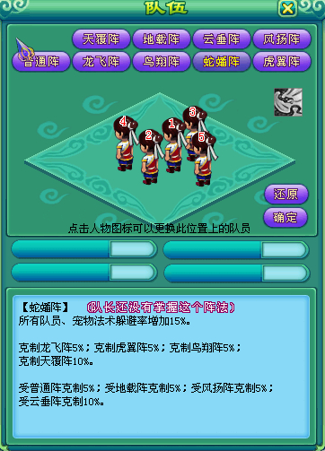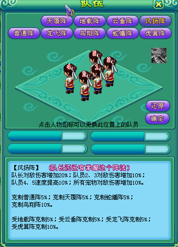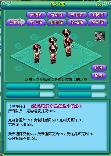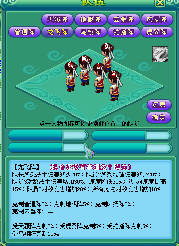 相关资讯: 讲解几个比较热门的阵法。 进入正题,一个好的阵法可以让团队的实力更加提高,打的更加精彩。一个漂亮的阵法技能可以使即将崩盘的局面逆袭。下面说一下目前最火的四个阵法:虎翼阵,龙飞阵,鸟翔阵,地载阵。 虎翼阵。群雄比武刷分首选阵法。别说天阵更快 你敢开天阵去打群雄吗?虎头强大的输出爆发力可以秒杀一队配合俩个防御输出位置。更可以说是战无不克,攻无不胜 。宝宝在减少百分之10的伤害可以让BB站的更稳。 虎阵阵法技能:猛虎添翼,更真犹如猛虎添翼。全队加伤害。让输出打出更刺眼的数字,第一回合受到伤害反弹一半给对方,就好像大唐用破斧的时候打出1000血一个反弹直接跪地。阵法建议在己方队员存活的状态下,对面输出没BB的情况下开启,因为没BB一般来说都出BB 他出BB 就浪费了一回合反弹的机会。 优点甚多。但也有缺点。遇到地阵 (同等级同实力的情况下)会打不出那些刺眼的伤害。前提最少三个输出的情况下。说实话,风阵现在开的真不多。虎翼阵现在这么流行。大克风阵打不出伤害。一般现在没人开风吧。 相关资讯: 龙飞阵,大家常见的一个阵,服战PK什么的用的也比较多,4号位置抢一速,3号位置既能尾速,又能让法师打出伤害,二号防御位置站的稳,五号输出位置强大输出,运用得到,犹如把对方困入死牢,冲也冲不出去,杀也杀不进来。 阵法技能潜龙勿用,更是让这条龙活灵活现,全体隐身一回合并使己方受到伤。害减少若干回合,还能破风的阵法。隐身这回合让己方补血,让对方浪费一回合输出,死局变活局。阵法建议在大唐扫完,天宫天珠完,狮驼飞机完后的第二回合用。这样不会被遭到集火,第三回合还能有效的输出,让对方防不胜防(注:隐身状态下可以喂血,用特技,喝酒后隐身状态消失) 相关资讯: 但是万物相生相克,这么好的阵在遇到鸟阵之后犹如一条火龙遇到水龙。鸟阵全体加百分之20的速度盖住了龙阵百分之15速度,开鸟的队伍必定做好了抢不到尾速的准备,所以说龙3尾速起不来多大的作用,在加上大克 会打起来相当吃力。 鸟阵阵法技能:鸷鸟翱翔。为己方增加“翱翔”状态若干回合,物理躲避和法术躲避提高,在己方队员存活的状态下开启,全队都有附加。 相关资讯: 最后来说下地截阵,地截阵:全体队员和宝宝所受到伤害减少百分之15。一般来说打持久战是最好不过。对于大型难度活动,开地阵能让队伍少承受伤害,更有利的输出。群雄前期不推荐,耐打,但是没输出,刷分慢。后期可以开地截阵,一般群雄都开的虎。反正我的队伍到后面都开地,总是大克。 地阵阵法技能:以逸待劳,给全队增加伤害若干回合,让队伍既有防御又有伤害。画地为牢,使首次受到物理和法术攻击百分之反弹一个画地为牢状态,让对方不能使用物理攻击(这个我看来就是鸡肋,不能物理攻击可以吃药),让对方速度降低(这个还不错)。 在此说下,鸟大克龙,地大克虎,对面队长是输出百分之八十是虎翼阵,对面队长是辅助百分之八十是龙飞阵,所以说见到对面队长是输出就开地载阵,辅助就开鸟翔阵。最终还是要看队伍配置。 相关资讯: 有很多人在问我,为什么四大热门阵没有风扬阵,这只是我的看法。前些日子来说,风阵可以说是最火的阵法,风一的输出位置不亚于虎阵,配合俩个速度伤害位置完美至极,但是三十年河东,三十年河西,随着虎阵被挖掘,在加上大克风阵,使风阵从历史舞台慢慢退出。 当然这不是主要因素,在我看来,现在全民提速,人们舍弃防御,把速度提到最高,变成纸糊的老虎,一碰就碎。所以说加百分之10的速度不如加百分之10的防御,多点生存,变个高级敏捷卡照样可以一速。 相关资讯: 首先说一下,每个阵都有每个阵的奥秘,不同的阵容用不同的阵打出来的会是不同的效果,只是分析一下每个阵法,没有歧视任何阵的意思,最终决定什么阵还是在队长身上。 风阵阵法,寒风袭营,有一定几率使对方四个目标进入“冰冻”状态(不会受到任何攻击,同时自身也无法执行任何活动),阵法技能不错,但是能用特技,灵心,或者龙阵阵法解除。阵法建议让高速封或者辅助用,在适当的场合,别看到对面就剩下一个人,来个阵法,浪费时间(注:,阵法有几率让对方不能行动,不是百分百) 云垂阵,队长所受伤害减少百分之40,速度减百分之30(法师带最合适吧)队员2,3,所受伤害减少百分之10,队员4,5,速度提高百分之10,这个阵法我们不常见的原因应该就是没任何输出位置吧,其实云阵打持久战也是不错的。 相关资讯: 接下来就是天覆阵,天阵不用介绍,FB,低难度活动最佳阵法,伤害高,刷分快。 蛇幡阵,所有队员和宝宝法术增加躲避率百分之15,神武这游戏几率性的东西都是很坑的,不如弄点实用的,对面要是法都是龙宫,阵就废了。 [编辑:绝对懒人]