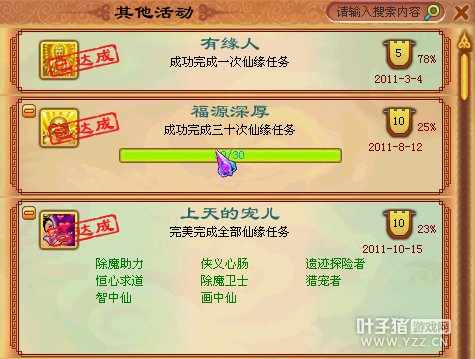 相关资讯: Top.6 福源深厚: 仙缘任务,感觉这个跟三界奇侠那个成就差不多吧!不过我还是选择了这个成就,放在了第八位。话说这个成就里面的随机刷出来的NPC的地点都是不一样的,跟三界奇侠里面的采花感觉好像有多少的相似吧!反正这个也是要有相当强的毅力才有可能拿到的成就哦,话说当时为了拿到这个成就我可是足足蹲守了好久才拿到了,差不多有个1-2个月左右吧!相当考验人的毅力。