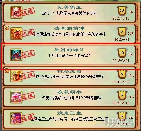 相关资讯: 神武最难完成的成就,你们完成了几个?下面就跟着小编一起来跟你们好好的点评一下,不过这也是我自己心目中最难完成的成就,不喜勿喷哦!下面就开始吧。 Top.10 福星高照: 没错就是祈福成就,看到这里或许有很多玩家就要喷了,不是吧!这样的成就也能够排到第十名?其实我想说,我玩神武也很久了,这个在我心目中真心很难,最起码我玩了3年神武,直到今年的4月12号才拿到这个成就,所有把这个排到第十名的话,感觉还是多少有点靠谱的。或许有些玩家刚开始祈福就拿到这个成就也不一定,但是如果真心第一次就拿到我不禁怀疑你是不是跟XX有一腿。 相关资讯: Top.9 文武双状元: 第九的给到的成就是御前科举,里面的文武状元,其实这个感觉也不是非常难吧!神武里面即使你不是很有钱的人民币玩家,或者土豪玩家,只要你是长时间在线的玩家,肯努力去刷经验、刷等级、刷装备,拿到武状元的称谓还是有可能的哦,至于文状元的话,跟武状元相比可能就相对简单一点吧!所有把文武状元成就排在第9位还是有一定的道理的。 相关资讯: Top.8 够杯具吗?: 又重新重温了这个成就,我真心是欲哭无泪啊,记得当时这个成就也很久了,11年的时候。当时杀幻境到最后了,我还跟自己的队友吹牛B说,等着吧!会给我一个神兽的。话刚说完,没错神兽出来了,当时就傻了,心想队伍里面5个人,我得到神兽的几率才20%。心里面一直在祷告,会不会给我呢?给我摇个100的点数吧!没错可能当时真的是老徐附体了,然后100的点数,当时笑得我啊,一想到神兽马上就到自己手里面来了,当时的心情真心无语用言语来形容了。然后没错得了这个成就,当时是什么情况你们就自己分析吧!队友也摇了个100的点数出来,好吧.... 相关资讯: Top.7 生肖的缘分: