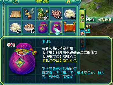 相关资讯: 第二个礼包,就是神武的新手礼包,领取地址http://card.yzz.cn/fahao-5886.html,这个是新手都知道了吧,切勿不能放过喔!里面的奖励还是很丰富的,我们只需要给青灵一个金钱草就可以换取我们的第二个礼包了!