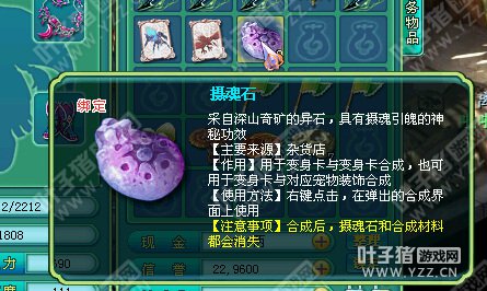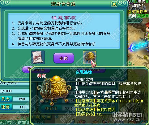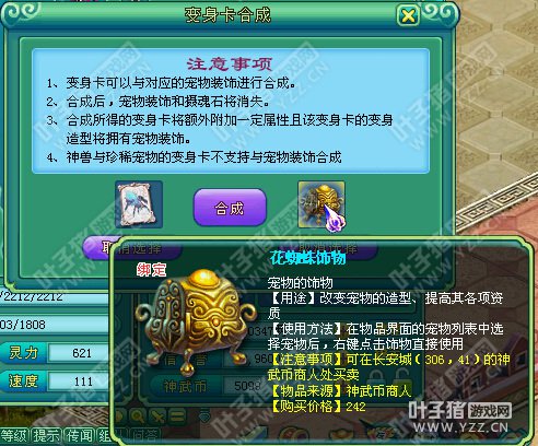 相关资讯: 还有就是摄魂石了,这个可以在杂货店轻松买到。 右键摄魂石,就会发现多了一项选择,选择变身卡和宠物装饰合成。 相关资讯: 宠物装饰只是放进对应的宠物装饰,其他的也放不了。 合成后就会显示激活了宠物装饰外观,而且还会附加属性。