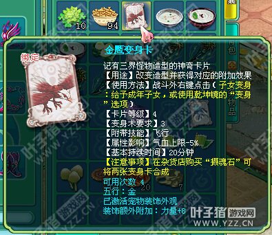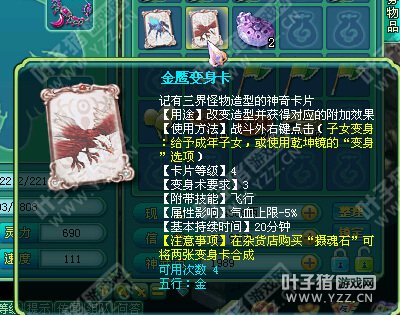 相关资讯: 效果对比,多了装饰的变身卡还能炫耀一下。 再次测试了下,装饰附加的属性是随机的,貌似更五行无关。 相关资讯: 我们再试一下金鹰卡。
