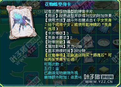 相关资讯: 最新更新变身卡和宠物装饰合成,不是说你买什么装饰就变成什么卡。而是在你原来的变身卡的基础上带上装饰。 打个比方,就是原来有一张金钱龟的变身卡,我们不能买个幽魂饰品和它合成让它变成幽魂变身卡,我们只能买对应变身卡的宠物装饰,例如金钱龟的变身卡就只能和金钱龟的装饰合成,合成之后使用变身卡时就会变成一只带了宠物饰品的金钱龟。 下面我们来实践一下看下这个变身卡装饰合成的效果吧。我们先用花蜘蛛卡试验一下,首先就要有一张花蜘蛛的变身卡。 然后就要买变身卡对应的宠物饰品,就是花蜘蛛饰品。