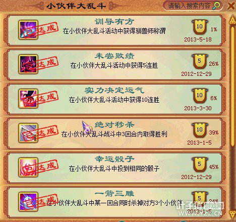 相关资讯: 玲珑宝塔的成就 我已经很久很久没有刷过玲珑塔了,感觉很浪费时间就这点奖励,打玲珑塔,最好是弄一只高神 高吸 高反震 高幸运 再加个夜战的BB 坐骑设置升龙加嗜血,假如你BB不飞,打到后面都是一刀一只怪的。 我就打到11层第9关就没再打了,好像之后是出了飞升每天都忙着刷经验,我就没再去打了。现在改过难度了,也不知道怎么样。没吃过血环,身上就带10品的归魂露打到11层。 生存冒险王 我们区很多人都知道我BB垃圾。。我是卡125级的渣渣PS,生存还好,封系比较抢手,想速度刷分基本上都是组2封3输出或者是1封4输出,差不多每次都是冒险王。 大闹天宫的那些成就,我听95的朋友说他们都是开小号刷分的,就是组一队小号过来点自己送分。等级太高了,都没人跟我刷分,高级的都不在意成就的,所以。。。后悔低级的时候没去刷!!! 相关资讯: 三界追捕的成就 三界追捕带小号杀超级快,2大号带3小号 或者是3大号带2小号 30-40级的小号,死了也没关系,一样有奖励的。万年只要3回合,九黎魔尊6回合封顶。