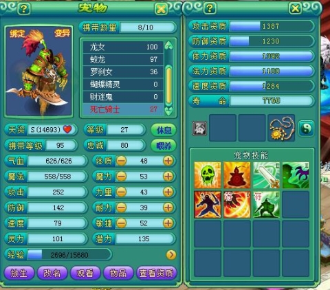 相关资讯: 上次巧遇一位大神,他说我骨骼惊奇,就传授了我洗5技能宝宝的技巧,于是我决定试验一下。 这就是这次的试验品,渣渣的变异死骑,洗一次要我74个丹,我也只能洗一次了。 大神教我的洗宝宝的时候,要在当前频道不停的发5技能,就让我来试一下真假。 相关资讯: 就点了一下!!!!这死骑!!!红色成长,攻资爆表,5个技能,送的技能还是送了个高偷,好强的咒语啊。