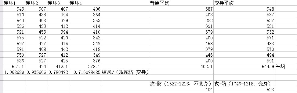 再来看看狮驼连环计的伤害系数 还是先上结论 连环第一下105% 第二下 95% 第三下 80% 第四下70% 由于本人ST号是99级 只能连击四下 第五下无法测试。 攻击减防御是404 由于ST号真元开的是变身加攻击 所以变身加了124点攻击(天魔里侦察术测试) 所以变身以后攻击减防御为528。 由于测试的次数不是很多 所以可能不是很准确 但是也大差不差 测试结果是第一下106% 第二下93% 第三下78% 第四下71% 还是考虑到应该是整数,所以取了 105% 95% 80% 70% (ST号的连环真元为几率加暴击)
