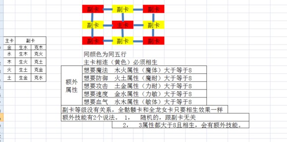 相关资讯: 关于新版的变身卡合成 可能很多新加入神武的小伙伴都还不太了解,下面我就为大家详细的解答一下变身卡合成的方法。 物理系卡片。 五行属性为金,上下左右的副卡五行为水时可达到相生效果。(2种属性大于8则加速度)适合力敏玩家,四个角落的副卡的五行为木,水生木、如此一来若是三种属性皆大于8且相生则有几率出现一个额外技能,当然这个暂时还不清楚是不是这样,也有可能技能是随机给的与五行无关。而且按照全部相生48点属性来看 完全可以出4个8 出3个额外属性, 五行为土,上下左右副卡五行为金,达到相生效果(两种属性大于8则加攻击) 适合力耐玩家,四个角落的副卡五行为水,道理同上 法系卡片。 五行为火,上下左右副卡为土,达到相生效果(两种属性大于8则加防御),四个角落副卡为金,以此达到全部相生。 辅助,封系卡片。 五行为水,上下左右副卡为木,达到相生效果(两种属性大于8则增加气血,也就是大幅度提升体质)四个角落副卡为火,以此达到全部相生。 再来就是关于颜色的选择,若是全部相生,单个颜色相连只能增加6点属性,为了能大于8点属性,获得额外加成,我们选择每种颜色只要相连两个如此一来可以达到4种属性大于8 增加三个额外属性 [编辑:Hi、何同學]