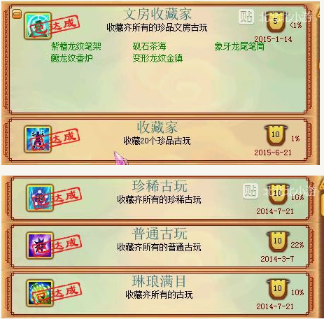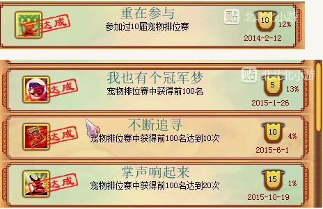 相关资讯: 隐藏的押镖成就,护送所有NPC,一共有六个NPC,虎子、柳千金、陆学霸、郭有财、苏苏、阿宝。 准备:几十两现金和至少两小时时间。 方法:领取押镖任务,如果不是护送NPC的任务,不要放弃,否则十几二十分钟内不能重复领任务。在押镖路上会遇到劫匪或者拼图,遇到劫匪就逃跑,遇到拼图就故意拼错,这样算任务失败,继续领任务,直到领到护送任务。 这是一个奇遇,帮派或者临仙玄修处点满2000点修炼,再跑200环修炼任务,再开21个修炼宝箱触发。地上会出现一个坐骑元神,点击领取奇遇, 以前要求40级以上,因为40级才可以点修,现在修炼任务降低到30级,不知道奇遇的等级要求有没有降低。 奇遇:70级以上,官职在正六以上,在擂台旁药雷儿处买擂台药,在擂台PK时吃掉擂台药,并获得战斗胜利时才能触发。 每天的10:45、11:45、12:45以此类推,到晚上11:45为止,都有几率出现通天神殿。 每次会出现2-3个入口,五人组队。成就取所有入口里最先进去的队长。 方法:45分之前组好队伍,一刷通天马上到离你最近的入口进入。 完整的卦象成就,检查检查自己有没有少的。如果是高级的,可以拿60装备开 这两个必刷。要求玫瑰雪莲不绑定无日期。 80级以上会比较好刷,镇魔经常能够拿到,80级以下不绑定无日期玫瑰来源比较少,除了采花出奇迹之外基本没啥来源,现在幻境的玫瑰雪莲都是绑定的。 自己开俩号刷啊,很快的,一小时就足够100次 旗包隐藏成就:一天三次旗包任务,带队连续两次答对才有。 以前需要找神偷大盗,现在更新了很方便,可以直接打个小混混然后找到神偷大盗猜暗号。 我刷的时候是大盗13,神偷24,但是也有人说是反一反,总之还是看运气; 很多人说用蛮熊来刷这个,楼楼自己总是刷不出。后来改了用野猪,成就到手! 方法:在商会买一只单技能雷系弱点的野猪,打一本小防御或者土系吸收都可以,二选一,(为什么打这两本呢?因为这两个技能是野猪自带的,这样增加了领悟雷系弱点的概率。)如果成功把雷系弱点顶掉了,就吃四五本宠物经验书,把野猪吃到40级,(如果你不嫌累也可以不吃书自己练宝宝去),如果40级还没有领悟雷系弱点,那么换一只野猪,重复以上事情。 楼楼刷了十多只就有成就了,十分钟的事情 方法:买一只大耳兔或者金钱龟都可以,谁的宠物装饰便宜就买谁,买十个一级玲珑花,染十次大耳兔或者金钱龟的饰品。 强调:染饰品,不要染宠物本体。 第一个除了九黎比较难,其他都是可以杀到的,一共有几种来着我数数:百年、千年、万年、九黎、巫妖王、巫妖傀儡、盗宝小妖、灵镜仙子(是灵境不我记不清啦反正是蝴蝶的那个) 第二个成就鬼区比较好刷。像世外天下这种区反正是没戏, 第三个成就是需要累积的,四周,因为是一个活动的我就一起放出来了。 两个烽火连城的隐藏成就。 这个为啥达成度不高呢?留点钱刷到9级直接买经验上10啊,老快了。 方法:去烽火排行榜上找个给力队长,跟他说你带我去杀个九霄云龙我给你100w现金。 钱全部留着,转换石也留着,可以换个宝宝,买几颗转换石,但是不买装备不买其他的。杀技能书的时候动作快点最好能刷两次,城一攻下来就去蹲着等刷技能书,不管是法师的还是将士的技能书,只要你没有就买。再去化外仙境杀两次技能,如果能出不一样的最好,出了同样的也没事。 先学自己职业的,化外仙境的书对属性要求很高。都学完了就可以转换属性学背包里另一个职业的技能书了。 相关资讯: 方法:和关系好会带队的朋友一起进去,然后撒个娇卖个萌(你要是不会撒娇就只能给点好处了)让他上你号带队,你上他号挂机。我就是这么刷的。 这个一下午就刷好了。 有钱的可以买蛮洞,没钱的看见人家找蛮洞队长你就去。也可以找几个想刷经验威望或者特别无聊的人AA买,你来带队。 6分钟这个需要每个人秒操作了,楼楼当时是少主的时候刷的,五输出(剑宗特别好用刷这个)。 方法:不杀对面宝宝(宝宝在就无法召唤了),集火杀人。如果不小心把宝宝杀掉了一只怎么办?方寸催眠啊(以防万一带个方寸去!) 方法,封PT和宝宝,特别是被点杀的人的宝宝,基本都是PT拉或者自己宝宝拉 方法:没场都先杀主 两个可以一起刷,对实力有要求,辅助喝酒放四海尽量保住宝宝的血线; 这个简单,让队伍辅助力保你,自己多带点血环,血线低于一半就自己喂个血。 杀1X,跟队伍说一声刷成就,宝宝死了都别出。一般安全的情况下队友都会帮你,除了爱挑事的。 1X,先杀主,一般队友都会配合。 准备好信誉,首先找一个大师级别的掌柜(这个不好找所以先准备好),然后等到员工日期到了不续签,心急的也可以直接把员工解雇了,然后在工商那里看其他玩家的员工,有大师级别的员工你就去就挖角。 双开就行,你带3只小伙伴(胜算大),另一个号带一只,到庭院发起小伙伴切磋,另一个号一直点逃跑就行。 两个烟花成就,第二个是隐藏的。最好每次放完3个在游戏备忘录里记一笔日期,不然八周很容易忘记或者弄混。 组合烟花的价格信誉比现金便宜,20w现金的组合烟花用11w信誉就可以买到,一样有成就,卡级的朋友信誉多可以用信誉买。 对同一只宠物反复洗出S也算多次次数的。所以如果仓库有没洗好的宝宝或者自己缺的宝宝可以抓紧去洗一洗。 如果是单纯想刷成就建议天兵或者凤凰,省丹,而且是低级宝宝里最容易出S的 两个隐藏成就, XX的比较好刷,XX基本没人杀一个点