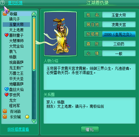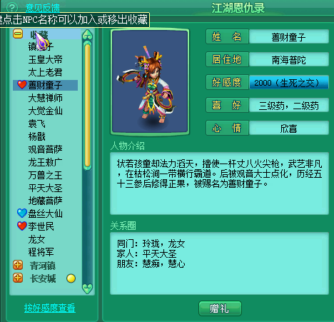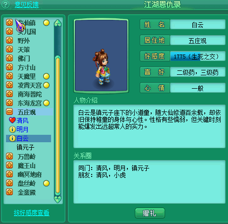 相关资讯: 那么问题就来了,如何把门派师傅最快弄到150好感呢,这个嘛,前期是很困难的,只能靠做师门(本门派的)然后还有恩仇录每天5次任务,有几率领取到师傅的任务(如果没有师傅的任务,建议大家做十二门派里面的NPC的任务,有一定几率给师傅增加的,因为12门派里面的NPC都跟本门派师傅是有朋友圈的),再一个呢,就是通过送礼,给师傅的朋友圈的人送礼,有一定几率会给师傅加那么1点(想要属性来之不易,毕竟150才能开始给师傅送礼); 这3个B呢,在3 4个月之前我就满了好感(2000)但是每天我还是坚持给他们送礼,为什么呢,因为他们跟很多师傅有PY交易,为了给师傅加好感,我还是继续给他们送礼,这就是我为什么恩仇录NPC加的那么快的主要原因了,我们一开始就要找准目标,不要给那些只跟1 2个师傅有关系的人送礼,这样等师傅150之后,这些NPC就没意义了,比如说以下2个逗比。 又截图截少了一个,明月也是生死之交,可是他们只跟WZ师傅有联系,所以,WZ师傅到了150之后,我很果断的放弃了他们。 我们的目标就是把师傅好感度刷到150,只要150到了,1500还不是随便来;so easy,步步高打火机,哪里不会点哪里首先呢,我们每天可以赠礼10次,这很关键哦,5个NPC,每个2次,基本上点头之交,莫逆之交,患难之交,你送礼是很少额外给别的NPC增加好感的,但是生死之交呢,你给他送礼,那么另外一个NPC肯定也能增加好感度(这就是为什么我有3个满好感的NPC,我还一直给他们赠礼); 我们一开始先选好目标,然后一直送一直送,直到一个师傅达到150,那就把5个NPC里面的随便一个换下来,也就是4个NPC+1个师傅,以我自己为例子吧,我一开始是送玉皇大帝 太上老君 善财童子 白云 明月(玉皇大帝 太上老君 明月白云都和镇元大仙有PY交易)所以我的镇元大仙甚至比程咬金好感度更快达到150(其实是我的老程做师门老是不给我好感啦)说回正题,我老程和WZ达到150了,我就把白云和明月放弃了,也就是变成TC WZ+太上老君 玉皇大帝 善财童子,然后一直送一直送(每天恩仇录任务记得要做,只能领5个任务)直到TC WZ1500,那么就可以放弃他们2个,隔2个星期送一次WZ就可以(NPC一定时间内不来往,也就是不增加好感,那就会掉好感度哦,TC我每天做师门可能会增加,WZ如果没有任务做,那就要送礼);你们也能看见我这2个师傅1500之后就没动了,为什么呢,因为反正只能加4点属性,就算2000好感也没用,最最最重要的是,FC和PT也到了150,OK,果断放下TC WZ,转FC PT,再加上玉皇大帝和太上老君 善财童子,然后你们回到上面看看,我HS LG DF都100+了,如果我运气不是特别差的话,在我FC PT1500的时候,这3个NPC也会到150,继续我们的老套路,放弃FC PT,如此类推,为什么我的师父会比别人好感加的快呢,这个很关键,因为我一开始选对了人,玉皇大帝和太上老君都跟5 6个门派师傅有PY交易,每次送礼给他们,都有一定几率给门派师傅加好感,这很关键哦; 最后呢,我给还没开始刷恩仇录的小伙伴一些建议: 要刷就刷:太上老君 玉皇大帝 李世民 南极仙翁 文曲仙君(后面两个是我最近发现跟特别多师傅有联系的,之前游戏里跟朋友说的那些,你们继续刷下去也很快的); 为什么选择这几个逗比呢,大家也能看见,我的明月白云都生死之交了,但是等镇元大仙到了150,他们2个就要放弃了,但是以上几位NPC不同,跟很多师傅有联系,这就可以让我们一直送下去,不会说谁谁谁到了150,就会荒废; 对了,患难之交还是生死之交(忘记了真是尴尬)每次节日,NPC都有一定几率给你送礼哦;虽然我没收过几次,不过朋友试过节日一天收3个NPC礼,一定是老徐妒忌我太帅; 补一个图,大家可以看到,师傅增加好感的速度就是这么快,其实呢,前期积累真的很重要,可能你觉得前期慢,但是磨刀不误砍柴工嘛,后面属性加的杠杠的。 那么这次关于“神武2恩仇录经验详谈:你比别人少48点属性?”的相关内容就到这里了,欢迎在下方留言讨论,了解更多神武3的相关内容请关注 叶子猪神武3专区。 [编辑:Hi、何同學]