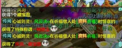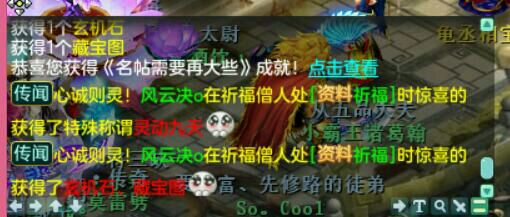 你们每天上线的第一件事情是做什么呢?做师门?蹲SX、36?刷副本?..... 小编第一件事就是去傲来僧人那里祈福,说不定能出个加属性的BUFF,或者是各种奖励成就。 就像这位玩家的一样,转出来一个成就还有五宝奖励。 相信你们都知道,祈福僧人这里每天都能祈福一次,转出来的个5个属性都相同的话,就能获得该属性下的一个称谓和成就,比如这个灵动九天; 还有前几天转出来的一骑绝尘; 这里一共有5个称谓成就,加上你在游戏中获得的其他称谓,凑齐15个称谓的话,就能再获得一个成就,名帖需要再大些。在这短短的几天里,这位玩家就转出来了两个称谓,可以说是运气爆炸,欧里欧气的了。 那么问题就来了,祈福这个成就怎么出呢? 诀窍就是连点+运气; 对,就是一直不听的点击让他转,经小编亲测,连点是最容易出现3个相同属性的,5个相同属性的话还是要看运气。 以上,笔芯! [编辑:Hi、何同學]