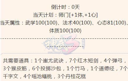 自从国家有了二胎政策,我们的神武也迎来了多子多女的精彩生活啦。夫妻俩每个人都可以带2个孩子,也就是!一共可以养4个小宝宝了呢。 宝宝的选择方面我推荐每个人带一个辅助孩子跟一个物理输出孩子。辅助孩子几乎是必带的,日常要灭队,打架处于劣势的时候,一排辅助孩子出来就可以拯救世界了呢。 之前一段时间比较流行火云孩子,可惜现在削弱了,加上打火系吸收的人太多,输出孩子的主流现在已经是物理孩子啦。 物理孩子中,我比较喜欢天魔孩子。因为蚩尤天魔孩子的镰鼬斩真的超级给力。在养过五庄,天宫,天魔三种孩子都养过一遍之后,最后选择了随身带天魔孩子出门。 为了养出极品孩子,参考过网上的攻略之后果断放弃,制定了超级节约成本又资质高的天魔孩子。 之前有查看小昕宝宝处的攻略: 可以达到武学与体质双百,但是这样心态只有81,而且4个瑶池蟠桃成本有点太高。 我们这个计划虽然武学只能到达99,但是体质也是100,心态更是能到达86,瑶池蟠桃的话只需要一个就够了,虽然不是进口奶粉,但是身为国产的奶粉却很实惠哦。 计划如下: 倒计时:30天 当天计划:竹马[+3武],竹马[+3武],竹马[+3武],急就章[+2心],千字文[+3心],千字文[+3心],金香果[+1体],金香果[+1体],金香果[+1体] 当天属性:武学9(100)、法术0(100)、心态8(100)、体质3(100) ------------------------------------------------------------------------- 倒计时:29天 当天计划:竹马[+2武],竹马[+2武],急就章[+1心],千字文[+3心],金香果[+1体],金香果[+1体] 当天属性:武学15(100)、法术2(100)、心态14(100)、体质7(100) ------------------------------------------------------------------------- 倒计时:28天 当天计划:竹马[+2武],投掷沙包[+3武],急就章[+1心],千字文[+2心],丹桂花糕[+3体] 当天属性:武学22(100)、法术4(100)、心态19(100)、体质12(100) ------------------------------------------------------------------------- 倒计时:27天 当天计划:投掷沙包[+2武],千字文[+2心],千字文[+1心] 当天属性:武学26(100)、法术6(100)、心态24(100)、体质14(100) ------------------------------------------------------------------------- 倒计时:26天 当天计划:投掷沙包[+2武],千字文[+1心],千字文[+1心],丹桂花糕[+2体] 当天属性:武学30(100)、法术8(100)、心态28(100)、体质18(100) ------------------------------------------------------------------------- 倒计时:25天 当天计划:拜入“天魔里”,师门[+1体,+1心],猴皮筋[+1武],弹弓[+2武] 当天属性:武学35(100)、法术10(100)、心态31(100)、体质21(100) ------------------------------------------------------------------------- 倒计时:24天 当天计划:猴皮筋[+1武],弹弓[+2武],丹桂花糕[+1体],师门[+1体,+1心] 当天属性:武学40(100)、法术12(100)、心态34(100)、体质25(100) ------------------------------------------------------------------------- 倒计时:23天 当天计划:猴皮筋[+1武],弹弓[+2武],丹桂花糕[+1体],师门[+1体,+1心] 当天属性:武学45(100)、法术14(100)、心态37(100)、体质29(100) ------------------------------------------------------------------------- 倒计时:22天 当天计划:弹弓[+1武],师门[+1体,+1心],丹桂花糕[+1体] 当天属性:武学48(100)、法术16(100)、心态40(100)、体质33(100) ------------------------------------------------------------------------- 倒计时:21天 当天计划:红木短剑[+1武],师门[+1体,+1心] 当天属性:武学51(100)、法术18(100)、心态43(100)、体质36(100) ------------------------------------------------------------------------- 倒计时:20天 当天计划:红木短剑[+1武],师门[+1体,+1心] 当天属性:武学54(100)、法术20(100)、心态46(100)、体质39(100) ------------------------------------------------------------------------- 倒计时:19天 当天计划:师门[+1体,+1心],红木短剑[+1武] 当天属性:武学57(100)、法术22(100)、心态49(100)、体质42(100) ------------------------------------------------------------------------- 倒计时:18天 当天计划:红木短剑[+1武],师门[+1体,+1心] 当天属性:武学60(100)、法术24(100)、心态52(100)、体质45(100) ------------------------------------------------------------------------- 倒计时:17天 当天计划:红木短剑[+1武],师门[+1体,+1心] 当天属性:武学63(100)、法术26(100)、心态55(100)、体质48(100) ------------------------------------------------------------------------- 倒计时:16天 当天计划:红木短剑[+1武],师门[+1体,+1心] 当天属性:武学66(100)、法术28(100)、心态58(100)、体质51(100) ------------------------------------------------------------------------- 倒计时:15天 当天计划:红木短剑[+1武],师门[+1体,+1心] 当天属性:武学69(100)、法术30(100)、心态61(100)、体质54(100) ------------------------------------------------------------------------- 倒计时:14天 当天计划:瑶池蟠桃[+1体],师门[+1体,+1心] 当天属性:武学71(100)、法术32(100)、心态64(100)、体质58(100) ------------------------------------------------------------------------- 倒计时:13天 当天计划:师门[+1体,+1心] 当天属性:武学73(100)、法术34(100)、心态67(100)、体质61(100) ------------------------------------------------------------------------- 倒计时:12天 当天计划:师门[+1体,+1心] 当天属性:武学75(100)、法术36(100)、心态70(100)、体质64(100) ------------------------------------------------------------------------- 倒计时:11天 当天计划:师门[+1体,+1心] 当天属性:武学77(100)、法术38(100)、心态73(100)、体质67(100) ------------------------------------------------------------------------- 倒计时:10天 当天计划:师门[+1体,+1心] 当天属性:武学79(100)、法术40(
