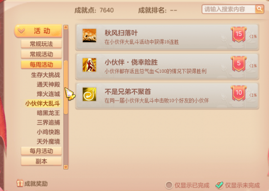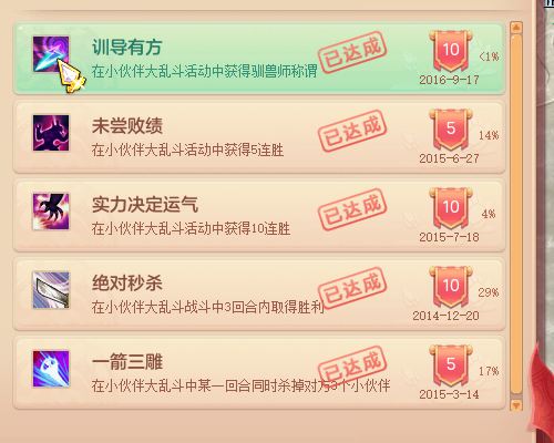 下面是一篇关于小伙伴大乱斗的攻略。 表示作为玩了8年多神武的玩家,我也是第一次写攻略,虽然我很喜欢逛贴吧,逛微信公众号,还有各种地方去看看神武的攻略或者玩家的心得什么的,但是确实是第一次写啊。之所以去写这个呢,一是因为看见登录界面上的招写手的公告,二呢主要还是出于个人原因啊,毕竟几乎最美好的年华都付给了这个绿色免费回合制游戏,总是想留点什么下来,才好像不空度我的那段岁月啊。 下面是正经的。 首先是活动的简介,时间么,生存过后的半小时,也就是每周六的16:30-17:30就是准备时间,17:00整开始匹配。 活动的要求呢主要是要三只40级的小伙伴,不过呢,没有也没有关系,系统会送你三只菜一点的让你照样可以参加活动,但是呢,基本就是去送人头的。所以我下面讲的呢,主要是给已经有或者正在培养小伙伴的玩家看的。 进去以后呢先选小伙伴的属性和技能,这可以说是最关键的一个环节了,这决定了你这次活动能拿多少分,可以说是7分靠选好,3分靠运气了。技能分主动技能和被动技能,每只小伙伴都能选择2个技能,主动被动自己随意搭配。既然这个活动主要是为了刷分,那么选择技能的时候呢,就不要再求稳啦,就是优先考虑输出高的,或者面板提升大的,而那些保命技能或者高强壮高幸运啊这些的,是二等选择。所以对于物理的小伙伴来说,优先选择的主动技能有哪些呢,个人认为,优先级最高的是:舍身,穿云斩 ,镰鼬,之后的么就是二等考虑的,譬如说怒雷、天诛、狮搏、蚩尤,剑气,有一些不需要考虑的呢,譬如说善恶、影牙、后发等等。而法的小伙伴呢,优先级最高的是雷厉,再其次是大法,最后是门派的法术技能,尽量不要选择单法技能。下面讲解一下这些选择的主要原因。 1、舍身,穿云斩 ,镰鼬,这3个技能是优先级最高的,为什么呢,因为这些技能是你能在2回合内干完对面三只的最好保障,也就是最快解决对面的时间,并且,自从孩子的门派特性加强以后,小伙伴大乱斗的所有门派技能也全都加强,也就是说,穿云斩 和镰鼬都是有50%加15%伤害的真元的,同理,怒雷和天诛也是加强不少的,p.s.镰鼬和穿云斩 哪个优先级高一点呢,我个人认为是穿云斩 ,因为穿云斩的蓝耗更高,当然这次的更新可能让镰鼬伤害回归到和穿云斩一样了也是有可能的。 2、天诛是一个很特殊的技能,有时候我会把它的优先级拔到最高,当然个人认为,天诛最多只能带1只,大多数情况是用来配合法宠或者剑气来第一回合稳定清1只,如果能稳定清掉对面一只,就可以节省1只的操作时间,也是刷分的一个小秘诀。 3、善恶影牙,后发,单法这些技能为什么不要选呢,就是因为不稳定,出手慢,伤害期望值不够啊等等的原因。 4、法宠的技能雷厉的数学期望值是最高的,所以优先级最高。 下面讲讲小伙伴的属性配比,一般来说呢,速度是最需要考虑的因素了,经过我多年参加这个活动的经验呢,速度在200是绝对很稳了的,但是一般来说,都会牺牲很多攻击,所以均衡下来,190或者185是最好要能加到的,其他的自然全加输出上了。p.s.个人比较喜欢加到192,202这些速度,因为你的对手很可能会喜欢加到200整,190整,这样你就能超过他了。。。当然这个是很私密的,一般人我也不会说的。 还一方面就是小伙伴的被动技能的选择,这可以和小伙伴的培养和HF的选择一起来说,被动技能首选一些输出高的,或者面板提升大的,而那些保命技能或者高强壮高幸运啊这些的,是二等选择,这是之前已经讲过的,举个例子,像偷袭啊,强力啊,敏捷啊,这些都是优先级比较高的,这些技能能帮你较快地刷分。P.s.活动中给的技能是不会有审判的,但是审判在HF上可以佩戴,这个JN是优先级也比较高的,因为大乱斗中小伙伴带神佑的真不少,带审判能加快刷分的节奏,因为一个小小的神佑就基本代表了你要多打一回合,就会浪费不少的时间。另外,高再生是个收益不错的技能,一方面是帮你在小伙伴冒险里稳定清小怪,另一方面在大乱斗中效果也是还可以的。 下面是一些我的小伙伴,当然这些是比较菜的,和那些大神养的全高完全没法比,但是我依靠这些就能挺稳定地拿到驯兽了。 这次的选JN呢,运气不是特别好,就拿最后那只法宠举例子,法宠呢,没有好的被动技能,例如灵性啊,毒,震慑啊等等的,只有高冰霜还和我自带的稍有重复,另外就选了一个低级法波,而最后那只蝴蝶犬呢,是我最喜欢的一只,这只是在活动外截的图,所以正好看看在培养的过程中需要注意点什么,一个呢我的加点方案基本都是全力或者全魔加,这样更符合我刷分的目的嘛,当然我也遇到过不少加防御的,甚至还有带肉盾小伙伴的,这些呢,可以帮你赢,但是刷分上呢可能就不那么快了,想我这种加点呢,要么快点赢,要么干脆也快点输了,很直接。这只的技能可以说是每个都是优先级很高的JN,他在活动外的面板就可以达到643攻击,159速度,基本在场子里可以到730+,200+左右的数值,可以说是很顶尖的了,可以明显的看出和其他的那几只的差距,但是倒霉的是今天在活动里我遇到的被动技能又是一堆很菜的,所以最后只能选了穿云斩和高反。另外在HF的选择上面,我选的HF是审判加敏捷的,也是一个对小伙伴来说很顶级的HF了,因为小伙伴只能戴2J及以下的宠物装备,所以在平常的时候也要多留心,给你的小伙伴留点装备。 下面讲讲这个活动有什么成就好拿 能拿到的基本我都拿到了,那