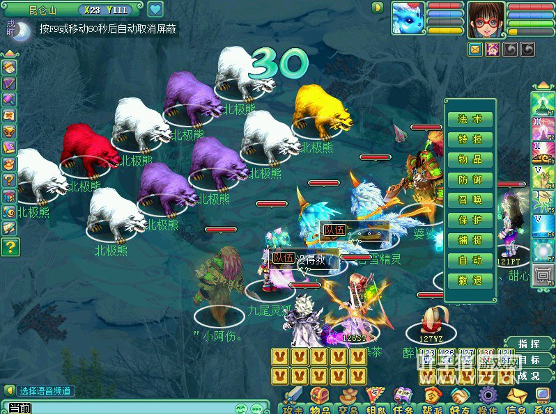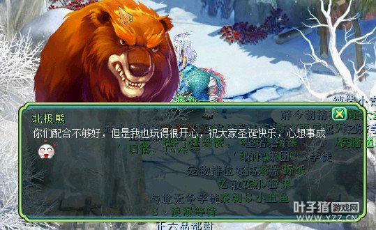 然后开战之前最好强调下,只打对着自己的两个熊,强调一下,别开奇葩阵法,天阵就可以了,不然不好对位置,实在不行就普通阵吧,反正这里不需要伤害多高。 熊会在被宝宝攻击(反击)或者是人物丢雪球的时候变色,所以我们要做的就是3回合之内把全部熊打成白色。 强调一下,千万不要用连击和反击的宝宝,也千万别手欠放剑气、群法一类的技能,不然直接坑爹。 3回合之内把熊打成全白色战斗结束,失败之后会有提示。 [编辑:强尼走路]