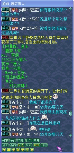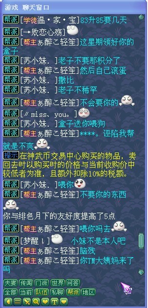 我一直觉得新势力挺和谐的也一直愿意呆哪里,觉得似乎有人情味一些,但是我发现所有人在利益面前会是其他的样子。也或许是等级关系吧,小号的悲哀,所以我先上图给你们看。 昨天的时候还没有出师我就在帮里说了小妹给积分怎样的,可是长老没有理我,然后今天又说了一次,本想用徒弟号说 (因为徒弟号是我自己练的)可是已经被t掉了。出师就t的那种。 然后我又喊了一遍。 我一直觉得自己是个好脾气的人,可是那是每天带封妖带抓鬼弄出来的号出师什么就t 喊帮里那么多长老都不答应,自己心里肯定也窝火。 我说了那是我学徒号已经说了不下10次了 !! 可是他们有答应有回话? 是帮主先开始骂我的,先发54,他说的好像还是我错了一样。 他不分青红皂白的就先骂我,这就是天下区新势力帮主的素质?我自己弄的号你凭什么不给我东西,那我不要东西了,你也能侮辱人阿。 你对你喜欢的兔子就那么好,对我们小号你就随便骂人,我只想告诉你小号也是有人格的。我老早就想离开你这帮了,因为你太冷漠太势力,新势力,真是人如其名。 |