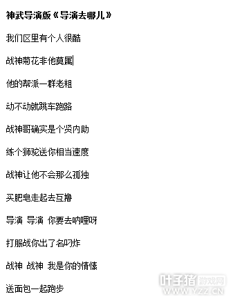 相关资讯: 接下来是大天下自导自演为主角的版本《导演去哪儿》,一起来看看吧。 附上原文: 神武导演版《导演去哪儿》 我们区里有个人很酷 战神菊花非他莫属 他的帮派一群老粗 动不动就跳车跑路 战神哥确实是个贤内助 练个狮驼送你相当速度 战神让他不会那么孤独 买肥皂走起去互撸 导演 导演 你要去呐哩呀 打服战你出了名叼炸 战神 战神 我是你的情愫 送面包一起跑步