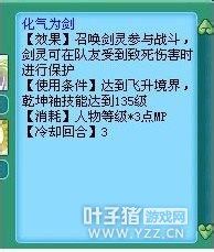 这个技能应该是参照天魔和魔王的套路出来的吧!当角色处于致死伤害的时候能够进行直接的保护。造型是直接出现一把剑出来,刚开始的时候误以为是给力五庄直接提升一定回合的伤害,看到化气为剑这个名字感觉很厉害的样子,其实后来才发现原先不是这个样子的。