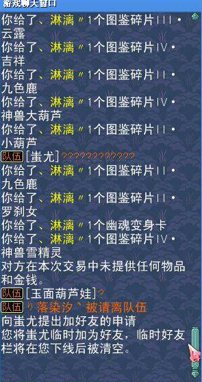 都怪自己进队伍没多口问一下……直接就给东西了!大家记得啊,现在天下无双居然也有这样的骗法了!大家小心吧,别被骗子利用了……另外希望各位大神也能帮下,赶走骗子!还我们一个干净的天下无双! [编辑:木偶]