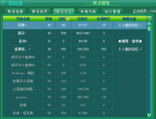 相关资讯: 【玩法调整】 1、新增帮派“师徒系统”: (1)等级<服务器等级且等级<80级的学徒可在帮派学徒指引人处拜等级≥服务器等级或110级的同帮正式成员为师; (2)师徒组队进行捉鬼、封妖、副本、剧情、精英支线玩法时可获得师徒积分和储备积分; (3)满足师徒出师条件后可与师父一起到帮派学徒指引人处举行出师仪式; (4)举行出师仪式后师父的储备积分将转换为师徒积分; (5)师徒积分可在帮派学徒指引人处兑换特殊的聊天气泡。 2、帮派学徒调整: (1)删除帮派学徒排行榜及培育积分相关内容; (2)申请成为学徒的条件调整为11≤等级≤服务器等级-20级且等级≤60级; (3)学徒在帮派出师的条件调整为等级≥服务器等级或80级; (4)学徒在帮派出师时帮派获得的培育礼盒调整为有几率获得1个; (5)培育积分称谓调整为根据已出师的徒弟数量领取,已有的培育积分将自动转换为已出师的徒弟数量。 申请学徒的条件,最高不超过60级,以及服务器等级-20,最低11级。学徒达到服务器等级或80级可以出师。80级以前且没到服务器等级的可以找帮内高级的为师。出师后双方都可以获得积分。现在60级以内都可以申请学徒,估计有帮派会对60级以下的帮众进行裁员,这样可以腾出更多的正式位置。 3、奖励中心等级礼包调整: (1)服务器达到100级之后,50级至90级的等级礼包新增对应等级的装备包,每个装备包都装有对应等级的一整套装备,完成对应等级的装备认证任务后即可开启; (2)服务器达到100级之后,60级的等级礼包新增宠物龙女,人物等级达到65级后可使用;同时宠物猫女调整为在20级可以领取,人物等级达到25级后可使用; (3)将原有分散在不同等级礼包里面的宠物装备,调整为一至四级宠物道具包,每个宠物道具包包含一整套对应等级的宠物装备和一些宠物道具; (4)提高了修炼丹、三界密录、还童丹等道具的数量。 节约格子,可以随时使用装备包来获得装备。 4、帮派新界面改版: (1)新版帮派界面以分页形式显示,包括主界面信息、成员信息、学徒信息、申请列表、统计管理; (2)主界面分页支持技能研究操作和帮派活动日程提示; (3)成员分页支持输入玩家id或名称快速查找对应成员功能; (4)学徒分页的培育奖励按钮将移到管理分页下; (5)统计管理分页仅长老以上成员或有学徒管理、驱逐成员权限的成员可见; (6)统计管理分页可查看帮派成员最近四周的经商和帮战次数,每周一0点刷新;经商次数从上周开始计算,帮战次数从下周开始计算; (7)申请分页将原成员界面和学徒界面的申请列表合并,并优化了接收成员和推荐成员的操作; (8)帮派界面原来的功能按钮,需要有对应权限才能查看并操作。 统计分页,可以统计最近4周参战次数。 5、优化了录像播放器的播放效果,现在支持自由切换回合,不再受回合大小限制。 之前回合切得过长会导致录像崩溃。 6、提高了11级装备之灵、12级装备之灵系统自动补货的几率。 7、诱毒之术调整为无法对处于分身状态下的目标使用。 之前系统可能判定为分段性质的攻击。毒是分段伤害叠加起来的。分段伤害会破分身。现在系统应该把诱毒术改成一次伤害性质了。 8、优化在战斗中使用道具的判断条件,避免部分不合理的操作发生。 【BUG修正】 1、修复了师门援助任务“受伤的弟子”在第五回合击杀目标后判断异常的问题。 2、修复了速升到100级,界面上显示的装备图标资源与装备等级不符以及血玲珑武器配置错误的问题。 3、修复了给已加锁和未加锁物品或宠物同时加锁时消耗体力异常的问题 4、修复了五庄观剑灵使用生生不息时,会错误触发被治疗目标的夜巫阳效果的问题。 [编辑:Hi、何同學]