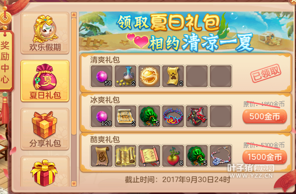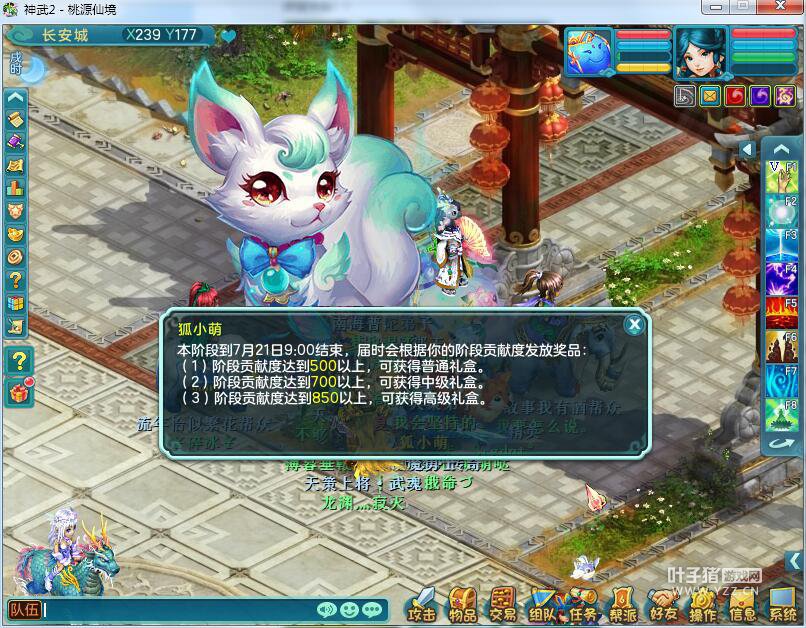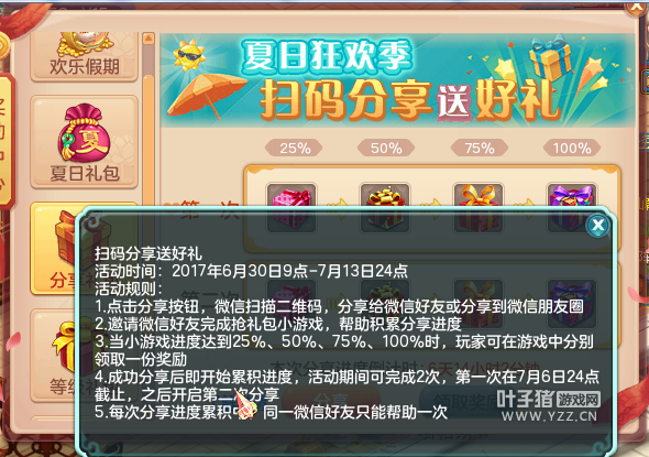 【2017夏日大狂欢】 1、2017年暑假活动将于6月30日至9月30日期间开启,参与活动获得积分提高欢乐等级,即可领取可爱的狐小萌及各种稀有的道具。此外,在暑假期间表现活跃的玩家还有额外的惊喜。以下就是今年神武2为大家献上的精彩活动: 活动一:阵营对抗 (1)活动时间内,等级≥30的玩家可在长安城(240,173)“狐小萌”处选择加入“狩猎者”阵营或“守护者”阵营; (2)选定阵营后,参加暑期活动得到暑假积分的同时会获得相应的阵营贡献度,选定阵营后则不可更改阵营; (3)选定阵营时,当某方阵营人数过多时,会暂时限制只能选择另一方阵营; (4)整个暑假活动分为4个阶段,每个阶段结束后会对玩家上一个阶段的阵营贡献度进行结算,对达到一定贡献度的玩家发放贡献度礼盒,打开礼盒后可获得丰厚奖励以及夏日狂欢券; (5)暑假期间获得暑假积分可相应提高自身欢乐等级,达到一定的欢乐等级可换取萌宠“狐小萌”,“狐小萌”饰物和珍贵的“玄灵丹”(可开启狐小萌的庭院观赏功能)。 参加暑假活动的大前提是先选定一个阵营,完成下面的八个暑假活动能获得活动积分和阵营贡献度,暑假积分能换取狐小萌等。阵营贡献度相当于多益周年庆的时候发放的徽章,达到一定贡献度发礼盒和抽奖券。 活动二:狐影迷踪 (1)活动时间为6月30日-7月20日,每日10:00-22:00开启活动,等级≥30级的玩家可到长安城(240,173)找“狐小萌”参加活动; (2)任务共7环,每环任务时间限制为60分钟,每人每天只能完成1次 (3)完整完成一轮任务后可获得暑假积分和对应的阵营贡献度,较大概率获得物品奖励; 任务简单,不同的阵营有不同的任务环。 活动三:保卫灵狐 (1)活动时间为6月30日-9月30日,每日10:00-22:00开启活动; (2)每20分钟在长安城外、大唐国境、大唐境外、花果山、昆仑山、乌斯藏刷出普通的怪物,30级以上的玩家可组成3人以上的队伍进入战斗; (3)服务器等级≥90的服务器,在临仙镇和女儿国刷新2个常驻的怪物首领,90级以上的玩家可组成3人以上的队伍进入战斗; (4)普通怪物每日最多只能获得5次奖励,怪物首领每日只能获得一次奖励(两只怪物首领所有难度共享一次); (5)怪物首领挑战中,优秀的战斗将被收录到排行榜,在阶段活动结束后发放奖励。 常驻的怪物首领跟SX一样有分难度等级,大家量力而行。 活动四:夏日密战 (1)活动时间为每周三,周五15:00-16:00以及19:00-20:00,30级以上单人可到长安城(240,173)找“狐小萌”进行报名; (2)每场活动包括10名玩家,若干名NPC; (3)活动过程中玩家需根据场上小动物的行为进行判断,找出玩家真身一击必杀; (4)获胜条件:获得15分或者结束时排名第一; (5)活动过程中每分钟有概率刷出宝箱,打开宝箱后可获得强力技能; (6)每人每天最多参加两次活动。 以前是不是玩过? 活动五:萤火虫之夜 (1)活动时间为暑假期间每天20:00-24:00,可到长安城(240,173)“狐小萌”处领取萤火虫之瓶; (2)每10只萤火虫可换取1个萤火虫祝福,每天最多换取5个; (3)萤火虫祝福可赠送给好友,赠送后可获得奖励; (4)每天捕捉到30只萤火虫后可获得使用机会; (5)在帮派、社区或庭院中使用萤火虫之瓶可吸引萤火虫的到来; (6)萤火虫会出现在长安城外、大唐国境、大唐境外、昆仑山、花果山、乌斯藏; (7)收到好友赠送的萤火虫祝福达到200个后可领取称谓奖励,9月30日活动结束后收取萤火虫祝福量前三名的玩家还可获得特殊称谓。 活动六:采西瓜 (1)活动时间内,每天的11:00-13:00以及18:00-20:00会在各地刷出西瓜; (2)人物等级≥30的玩家,每天可以摘取三个西瓜,并有机会遇到狐小萌,获取丰富奖励及暑假积分; (3)西瓜的奖励高于赐福宝箱,活动期间将不再刷出赐福宝箱。 不刷出赐福宝箱,帮派的卷宗在暑假期间也没有了.. 活动七:深海捕鱼 (1)活动时间内,每逢周一的15:00-16:00以及19:00-20:00,30级以上玩家可组成5人队伍可以前往长安城(240,173)找“狐小萌”进入深海捕鱼; (2)新增随机道具“超级金网”,使用后可同时洒出7张金色渔网; (3)参加捕鱼活动可以获得暑假活动积分,捕鱼得分高于1500和2000的玩家,将获得额外积分奖励。 活动攻略:http://sw.yzz.cn/exp/201706-1145705.shtml 活动八:运筹帷幄 (1)活动时间内,逢周四15:00-16:00以及19:00-20:00,30级以上玩家可到前往长安城(240,173)找“狐小萌”进行报名; (2)新增棋子“炮”,可以与敌方任一棋子同归于尽; (3)每天参加活动次数无限制,但每人一天最多可获得2次活动奖励。 活动九:躲避猎人 (1)活动时间内,每周二的15:00-16:00、19:00-20:00,30级以上玩家可组成3人队伍前往长安城(240,173)找“狐小萌”进行报名; (2)在规定时间内,灵狐阵营需在躲避猎人追捕的同时开启所有的宝箱才可获得胜利,猎人阵营需将所有灵狐全部捕捉后方可获得胜利; (3)活动中表现突出可获得稀有成就; (3)每人每天最多可参加两次活动。 官兵追贼的另一种说法。 2、夏日抽奖大狂欢: (1)活动时间为6月30日维护后-10月7日24:00; (2)活动时间内,打开阶段奖励的贡献度礼盒可100%获得一张“夏日狂欢券”,使用后可进行抽奖; (3)每个角色在活动期间最多只能进行4次抽奖; (4)抽中的实体奖会在登记完成之后的15个工作日内送出。 抽奖什么的还是要看脸。 3、微信扫码分享拿大礼: (1)活动时间:2017年6月30日9:00至7月13日24:00; (2)人物等级≥30级的玩家可在奖励中心——分享礼包页面中扫码分享至微信,邀请微信好友完成抢礼包小游戏,