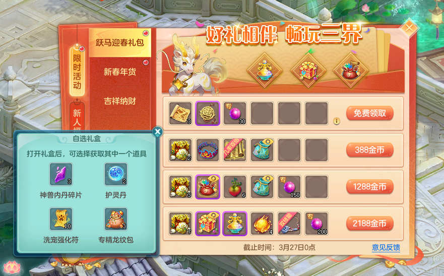 幻唐志新春年货率先开启囤货狂欢,春节限定四档礼包即将上线,鸿运礼盒、神兽内丹碎片等养成好物已备好。 新春年货抢先囤 新春年货将于1月30日本周更新后上线,购买年货可立即获得鸿运礼盒,聚宝盒等好礼,此外还有固神丹、神兽之灵、强化洗宠符等丰厚道具。不仅如此,春节期间,腊月二十八、正月初一、初三、初五和初七将陆续解锁神兽之灵、兽魂果等道具奖励,当日上线还可额外领取烟花好礼! 跃马迎春礼包即将上线 跃马迎春礼包将于1月30日正式上线,礼包可自选3个神兽内丹碎片、10个洗宠强化符等丰厚好礼,助力少侠们更快兑换出神兽内丹,洗出心仪宠物,轻松闯荡三界! 吉祥纳财火热进行中 吉祥纳财活动正在火热进行中,消费储币享高额返利,完成活跃领银币好礼,最高可获得588888银币!另外新春系列奇遇已开启,本周还会开启后续的故事,期待少侠前往体验! 欢迎在下方留言讨论,了解更多幻唐志的相关内容请关注 叶子猪幻唐志专区。 [编辑:ssc]