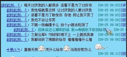 然后楼主不高兴他不回我就好友秀发了句,有借有还嘛。 放完pt也别装死吗,好吧就算楼主这句有点微微骂人了。 你也可以私聊告诉我你去吃饭了对吗。 这样我也会自责自己怎么那么不理智呢? 然后此时此刻就更新了好友秀啊,也没告诉我会还卡。 然后就说我催催催,楼主6月借的现在都要开学了,楼主催催催催到现在才要到。 还说我说难听的话。。楼主就发了句有借有还,本来不想说谁,可是怕他不知道。 我就在ps了句,麻痹什么时候还我幽魂卡吖,麻痹不是骂人#1,是他之前的名字。 然后楼主就委屈了,干吗那么说我,我又没想你取悦我,我只是单纯的想要回一张卡嘛。 而且他也说了6.7张也不知道要记得还给我#11,多难过啊,都没想还了还怪楼主快学催他还。 今天早上考完试心情愉悦回家说和傻鸡去烧三,然后就看他删我好友了。 我就想都删好友了还是把卡拿回来吧,于是就和他说你还我卡。 咱俩就好聚好散嘛~ 于是就狗血的出现了。 主要那时候楼主在做ps血环可开心也就没计较。 然后我就问你2点吃到5点,于是啊就说,他当时不想理我。