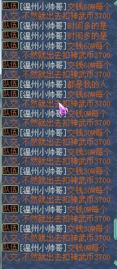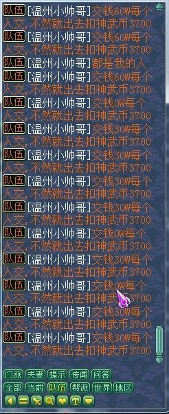 今天楼主小号进去刷50副本,刚组好队来没来得及开打,惊人的一幕诞生了! 原来我们进的不是副本,是一首贼船。 事情是这样的,带头队长私聊了我,要求我配合他圈钱。 我觉得太荒唐了,但是他竟然告诉我刚才就已经骗到了。 来了!队长向队里的其他2个小朋友开始叫他们交钱,一开口叫价60W! 队里的其他人都觉得很荒唐,没有想叫钱了事,而队长也告诉了他们不交钱就花自动离队会扣3700神武币。 队长一直在刷,半小时过去了还是在刷,是谁给你了这样的毅力和勇气。 队长好像开始有点忍不住了,开始降价了,从原来的每人60W变成了每人30W。 我们的队友都不向恶势力地头,在到处跑开了。 执着的队长!坚强的毅力!无比的勇气!队长,请让我膜拜一下。 又降价了。变成10W了,怎么办,再不交会不会撕票的? 队长果然是有大号的人,还问我要不要跟他混,但是这次没混到钱啊。 队长说是因为这些等级太低了,表示队长非常的执着和有毅力!我毫不犹豫的跟老大赚大钱去了。 此树由我栽,副本由我开!要从此路过,留下买路财!从此决定跟老大征服所有的副本! [编辑:绝对懒人]