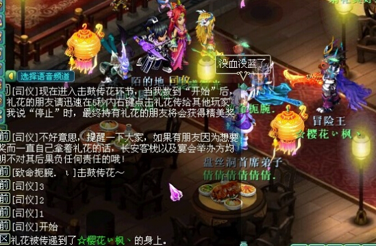 其次是击鼓传 实际上就是轮着放烟花 挂机就被炸! 这个被炸可不是帮派烧烤被炸 而是蓝炸没 血炸出伤不过运气好最后到你挂机可能会得东西 具体玩法就是司仪宣布开始 被炸的话长安客栈不负责之后~ 你要注意地区频道 看着烟花传到谁那里 如果是你 不要东张西望! 点开背包右键 放烟花! 就到下一个了 。 抢宝箱呢 应该都比较了解 司仪倒计时开始后 眼疾手快就可以了 宝箱就长副本那箱子的样子! 一次可能刷一个二个三个不等 四个我还没见过宝箱可能是空的可能是东西 也可能是二十秒的变身卡 还可能是多吃一道菜 这个多吃一道菜就意味着你是白吃 哈哈哈 多吃一道菜没有太过实际的意义 如果你之前忙 第五道菜时候才进来 那么你就是幸运的 多吃一道菜就帮你补回来啦。 照样也可以吃最后的荟萃啦 |
