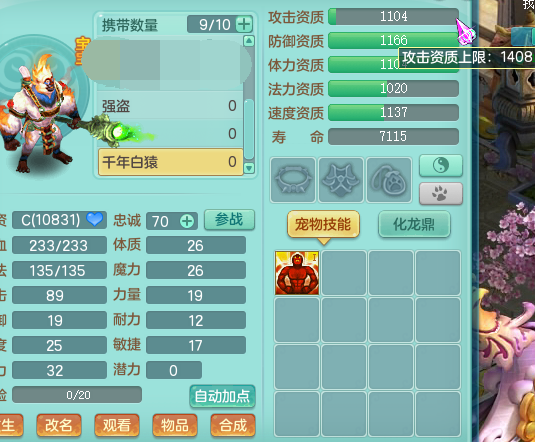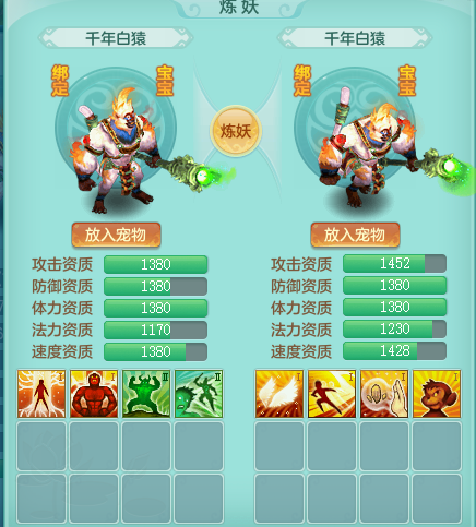 准备炼妖,抓了两只千年白猿,先要打掉天生技能,这样两个四技能的BB说不定就炼妖出来个八技能呢。岂不是美滋滋。 万万没想到,一个高级追击居然互顶了20本书才算是下去了,这三低一高的打书难道不都是很容易就打掉高书吗? 都说三高一低难掉一低,原来三低一高也难掉一高啊! 好了,两只四技能的千年白猿就位了,炼妖启动。 可以的,坑了20本兽决才打掉的高级追击,就出了这货? [编辑:Hi、何同學]