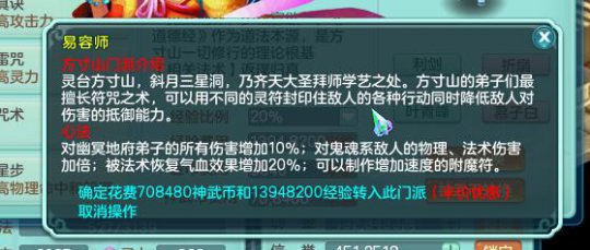 神武2里一共是有12个门派,相信每个玩家都有自己的一个本命门派,对于其他的门派也会有想玩的冲动,但是每个人的精力有限,不能每个门派都玩起来。于是就有了转门派。 趁着现在转门派半价,蓬莱仙境的125级力五庄,就要转去方寸门下了。一起来看看从物理转去封系会发生啥事吧。 这段时间转门派既有半价,又可以用经验抵消转门派的费用,传说中的折上折,挥泪大甩卖。这次转门派一共需要708480神武币,四舍五入就是71W。 其实本来是少25神武币才能转的,奈何SX,TG,FB,妖王什么的全都弄完了。。绝望之际突然想起来这个东西了,哈哈.... 最后剩下75神武币,太穷了。 转完门派之后要加点了,原本装备都是单加力量的,怎么玩,如意宝玉也买不起了。 身为FC之后第一次去FB就被带走了,心累,幸好不PK,就日常玩,各种混队也不错。 你准备转门派吗? [编辑:Hi、何同學]