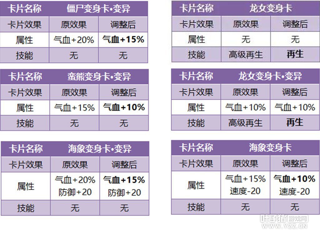 神武官方爆出的九月份更新前瞻,早在之前就已经曝出部分变身卡效果的调整,下面是小编为大家整理的一些资料! 由这张图片可以看出来九月份更新的内容,主要就是围绕着6大玩法 阵法效果调整: 1、龙飞阵:四号位速度加成:由15%调整为10% 2、鸟翔阵:一号位速度加成:由25%调整为20%,其余位置速度加成由20%调整为15%,宠物速度加成:由20%调整为15% 3、虎翼阵:四、五号位置伤害加成:由10%调整为15% 4、蛇蟠阵:阵法技能:在原基础上新增法术命中提高的效果 5、地载阵:阵法技能:在原基础上新增受到封印法术时也会反弹沦陷效果(沦陷:降低速度,无法使用物理攻击) 战斗逻辑调整: 1、提高宠物力量属性对灵力的影响 2、复活法术、特技调整为:不受治疗相关卦象效果加成的影响 (也就是说任何卦象在拉人的时候不在享受治疗卦象加成) 坐骑性格调整: 1、坐骑性格克制调整为:性格克制时,对其造成的伤害增加10%,性格被克制时,不再降低伤害。 2、莽撞触发几率调整:由10%调整为15% 3、胆小触发狂暴几率调整:由 3%调整为5% 4、去除冷静被攻击时有15%几率免疫偷袭、气势、震慑类技能效果的设定 坐骑性格克制关系:莽撞->胆小->冷静->莽撞 驭兽技能调整: 1、挣扎的触发概率调整为100% 2、先锋技能调整:40%概率忽视目标10%防御力调整为40%概率忽视目标20%防御力,额外新增效果:使用单体物理技能时额外提高10%的触发几率。 宠物技能调整: 1、永恒跟高级永恒技能效果回合数调整为:2、4,同时阵技buff不再对永恒生效。 2、强力跟高级强力调整为:不受防御、高级防御影响伤害结果 (也就是说强力不受防御技能的克制) 3、高级逆击:对未出手的单位伤害提高到15% 4、毒跟高级毒调整为:对携带强壮目标的概率翻倍,去除原有的毒伤害对强壮目标翻倍的设定 5、厄运跟高级厄运调整为:驱逐buff的条件调整为lv*4,几率相应调整为25%、35% 魂技调整: 1:斩灵调整为:触发条件由灵力的80%调整为灵力的60%,同时调整降低法术攻击力的算法 2、力破调整为:触发条件由攻击力的40%调整为攻击力的25%,同时调整了降低攻击力的算法。 3、调整力量点数、魔力点数对破法、破盾的几率影响 4:瞬法调整为:造成的伤害由50%调整为正常伤害 5、复仇调整为:由“每个被击飞的宠物提升自身2%的物理伤害结果,最多提升5次”调整为“提升自身5%的物理伤害结果,最多提升3次” 以上就是今天曝光的所有内容,后续还有更多的曝光内容小编会继续更新