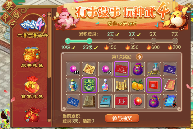 1月3日,《神武4》电脑版公测开启,极致的回合策略战斗、有温度的社交互动、多元化的休闲养成,期待每一位神武少侠前来体验。同时,“二〇二〇”年度大服现已开启!二〇二〇盛典快乐抽奖、天降红包雨、新服冲级好礼等福利联袂登场! 小伙伴们可以在本帖评论区中进行#组队招募# ,单独发帖将被隐藏哟~ 二〇二〇盛典快乐抽奖 游戏内外豪礼大放送 新年新福利,《神武4》电脑版二〇二〇盛典 活动今日上线!即日起至2020年1月12日24:00期间,登录的角色均可以参与盛典活动(每一个帐号下仅一个角色参与),当角色达到一定等级、累计登录一定天数和活跃度时均可以获得抽奖机会,抽取重重豪礼!更有鼠年神兽“鼠剑仙”等海量福利,与《神武4》玩家共迎2020新年的到来! ![]() 【二〇二〇盛典 活动】 年度数字大服开启 冲级好礼享不停 新服开服7天内将撒下红包雨,不仅有海量信誉相赠,更将送出神兽、全新时装、新双人坐骑等珍稀道具! 此外,新服冲级还能赢取额外好礼!2020年1月3日-2020年1月12日,在新服“二〇二〇”活动期间,角色达到30/35/40级后便可打开冲级红包,有机会领取五宝、宝石等好礼。角色等级越高,即可获得越丰富的奖励!打开40级的冲级大红包还有机会抽取源生之灵·神兽,兑换一只神兽!在1月11日19:00-24:00期间,等级达到40级且在线的玩家可开启冲级大红包。 新角色专享福利 桃子小昕萌宠免费送 助力新角色在《神武4》世界快速成长,全服所有新角色25级即可免费领取桃子萌宠,30级并达到活跃条件即可把小昕萌宠带回家!同时,第二天登录还可获得天蓬限时助战,战斗内助你降妖伏魔,带你闯荡三界! 那么这次关于“神武4电脑版新服“二〇二〇”组队招募帖”的相关内容就到这里了,欢迎在下方留言讨论,了解更多神武3的相关内容请关注 叶子猪神武3专区。 [编辑:大主顾]