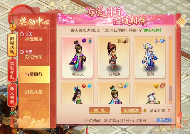 《神武4》电脑版与爱同行活动限时开启,小昕社区、鹿蜀音乐台优化、头像秀礼券调整等一系列内容全服开放,趣味玩法、贴心功能、缤纷福利期待每一位神武少侠前来体验。 与爱同行节日活动限时开启 珍稀道具等你来拿 《神武4》电脑版与爱同行节日活动正式开启,5月7日至5月16日活动期间,30级以上玩家每天达到60、120活跃度后即可获得爱心礼物,将爱心礼物赠送给程夫人、万兽通、夏荷等不同系统角色即可赢取珍兽之灵、神兽之灵、高级魔兽要诀、山水玄机图等珍稀道具奖励。 【《神武4》电脑版与爱同行节日活动限时开启】 需要注意的是,与爱同行节日活动部分奖励概率还将根据赠送礼物对象有所变化,持续为三界少侠送出更多节日惊喜。 小昕社区全服开放 音乐台优化等系列内容同步解锁 在限时推出与爱同行节日活动的同时,《神武4》电脑版小昕社区、鹿蜀音乐台优化、头像秀礼券调整等一系列内容全服开放,趣味玩法、贴心功能期待每一位神武少侠前来体验。 小昕社区 本周维护完成后,小昕社区全服开放并完全替代小昕问答与游戏知道,原游戏知道中的活跃玩家将会获得限时的“社区先行者”头衔和标识且会在小昕社区中展示,届时,诸位少侠不仅可以在小昕社区向其他小伙伴寻求帮助,还可以通过小昕社区对奇遇、恩仇录、成就等玩法交流心得,致力为三界少侠搭建起一个沟通交流、快乐交友的综合性平台。 【《神武4》电脑版小昕社区全服开放】 鹿蜀音乐台优化 鹿蜀音乐台新增13首门派音乐、8首背景音乐,帮派篝火厨师NPC同步新增新增音乐台功能,诸位少侠可以通过音乐台欣赏神武主题曲、门派音乐和背景音乐,持续每一位神武少侠带来更畅爽的音乐视听体验。 头像秀礼券调整 正式推出高级头像秀礼券道具,玩家赠送礼券功能可赠送道具同步新增高级头像秀礼券,使用后可以直接购买风格8至风格11头像秀。与此同时,玩家还可以通过头像秀礼券与金币组合的支付方式购买风格8至风格11头像秀,助力三界少侠打造更个性化人物形象。 与爱同行节日活动限时开启,珍兽之灵、神兽之灵、高级魔兽要诀、山水玄机图等珍稀道具诚意回馈;小昕社区全服开放,鹿蜀音乐台优化、头像秀礼券调整同步解锁,趣味玩法、贴心功能期待每一位神武少侠前来体验。《神武4》电脑版与爱同行节日活动5月7日至5月16日持续开启,更多精彩欢迎登录体验! 欢迎在下方留言讨论,了解更多幻唐志的相关内容请关注 叶子猪幻唐志专区。 [编辑:ssc]