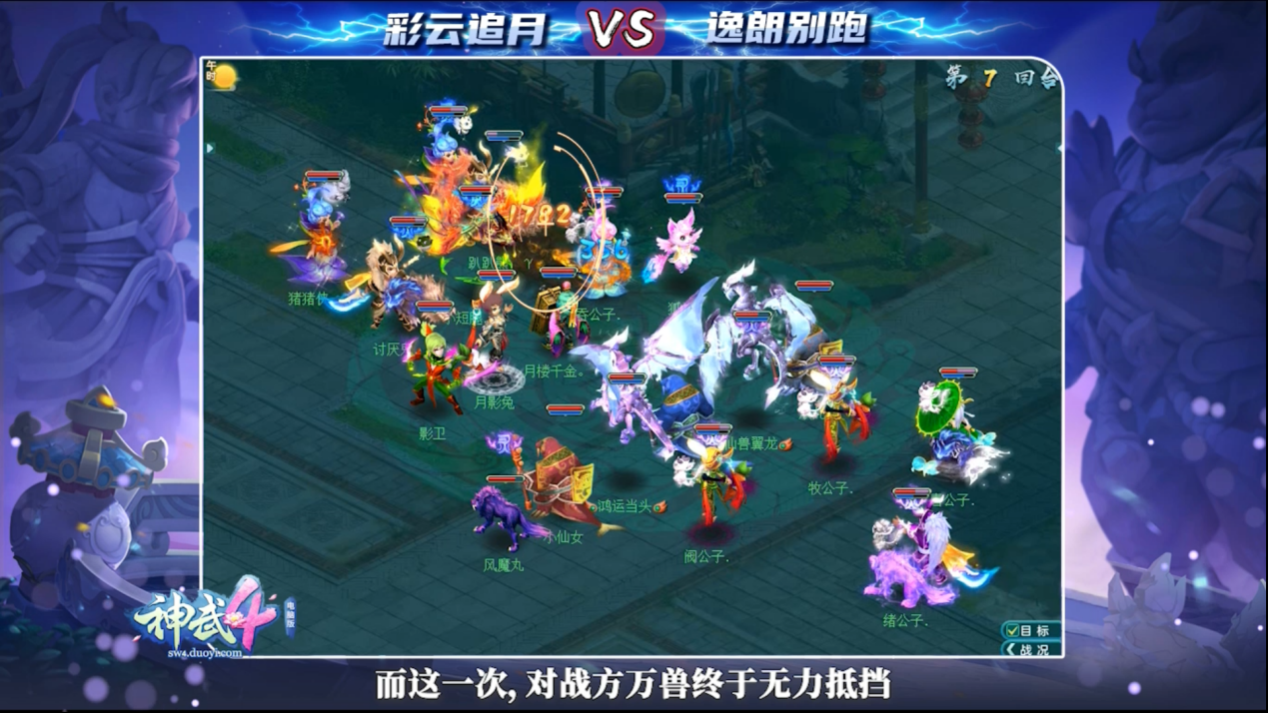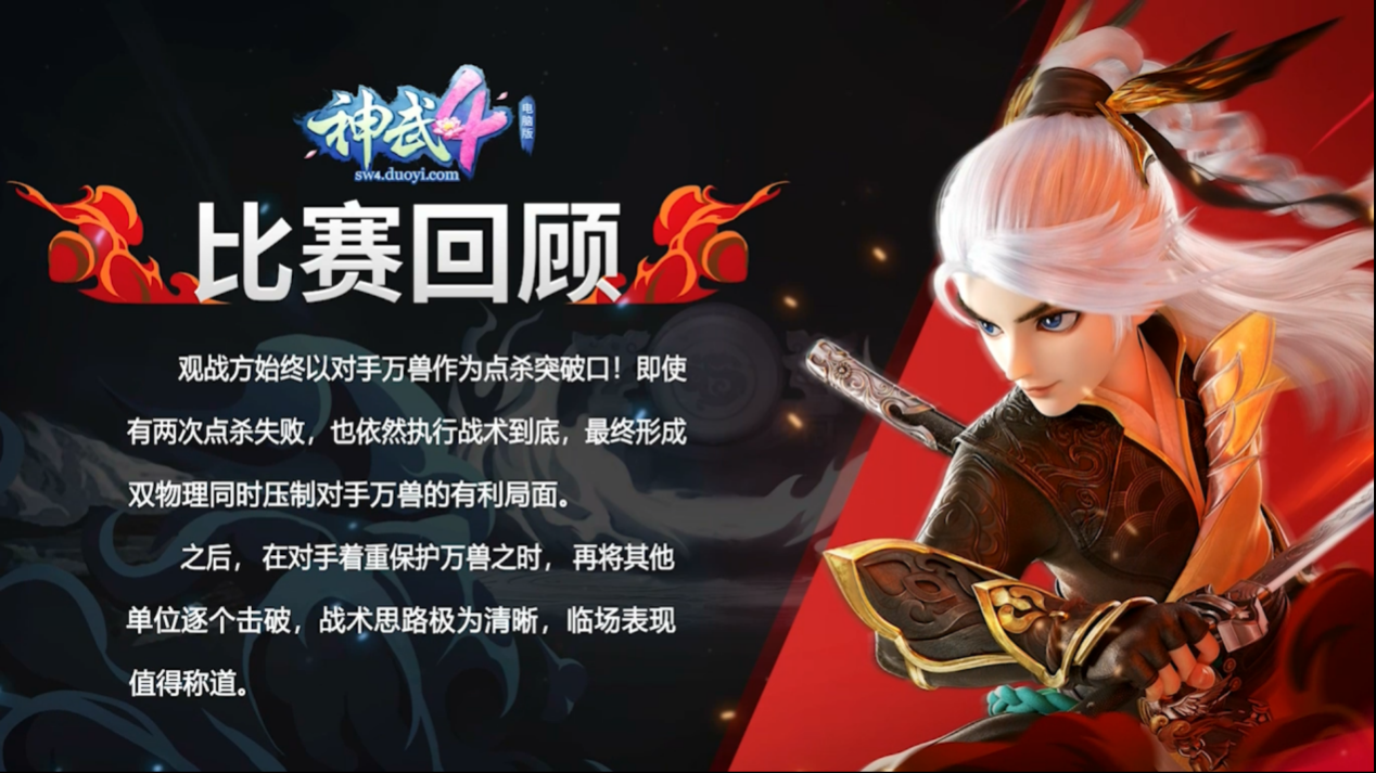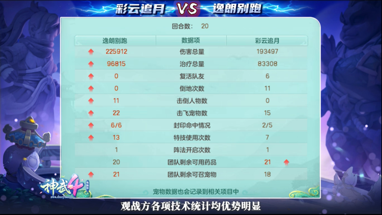 欢迎大家收看本期一分钟速读比赛今天为大家带来第17届排位赛全明星120-129级总决赛“逸朗别跑”vs“彩云追月”的比赛解读一起来看看吧! 欢迎大家收看《神武4》电脑版一分钟速读比赛。本期小吉祥为大家带来,第17届全明星120-129级别总决赛的对战解析:观战方“逸朗别跑”战队VS对战方“彩云追月”战队。 阵法上:双方均以进攻为主,选择也都是攻击型阵法,观战方:“虎翼阵”;对战方:“风扬阵”阵容上:双方分别:以“双物理”与“双法系”为核心组成三输出战队;观战方:天魔、普陀、天宫、无名谷、龙宫;对战方:方寸、普陀、万兽、龙宫、魔王;首发宠物方面:观战方:剑气、“青霜剑舞”神兽强势出击;对战方:五贪狼严阵以待。 比赛前5回合,双方展开对攻清宠,观战方拥有速度优势,对战方则接连触发“必杀”,战局可谓旗鼓相当。 均势局中,对战方未雨绸缪:依靠普陀“莲心琉璃”优先预判防点到位!观战方果然中招:天宫“惊雷斩”配合龙宫“龙行八荒”的点杀完全无法撼动“琉璃”状态的万兽,点杀因此失败。而后,对战方再次展现精彩预判:对战方万兽依然凭借普陀“莲心琉璃”做好预判防护,观战方天宫、无名谷、龙宫的联手点杀再度被破解!观战方布局点杀竟接连失败,局面因此陷入被动。 第6至10回合,观战方虽连失两阵,非但毫不气馁,反而攻势更胜:依靠普陀套装“阴魂不散”配合天宫“封魔斩”、无名谷套装“横扫天下”再度发起点杀!而这一次,对战方万兽终于无力抵挡,被击杀倒地! 顺利拿下首杀的观战方攻势更盛,尤其以无名谷表现最为出众:依靠套装“横扫天下”的强劲输出,再将对手魔王斩杀!双杀在手,观战方开始逐步建立优势。 第11-20回合,对战方急于挽回劣势,却忽略了细节处理:先是在万兽休息的回合意图强点观战方天宫,但却未有“清心术”保障出手,致使魔王遭到封印,仅有龙宫一点“烽火连城”点杀未能成功。之后在点杀观战方无名谷时再度失误,无人为空蓝万兽加蓝导致万兽惨遭罚站。 对战方两次失误,自然被观战方抓住:先是天宫“嗜血连击”再度将万兽击杀;而后无名谷“云龙三现”、破碎宠物配合龙宫“飞龙镇海”将魔王击倒! 面对观战方的强大压制,对战方人宠双线溃败,任何防御手段都难以奏效。而观战方越战越勇:竟在单回合中连续将对手五人两宠同时击杀!以一手极限“七杀”一举终结比赛! 最终,观战方“逸朗别跑”战队凭借强攻制胜,拿下本届全明星120-129级冠军! 赛后总结 结合双方数据来看:观战方各项技术统计均优势明显,攻防两端均是滴水不漏,表现近乎完美。 复盘整场比赛:观战方始终以对手万兽作为点杀突破口!即使有两次点杀失败,也依然执行战术到底,最终形成:双物理同时压制对手万兽的有利局面。之后,在对手着重保护万兽之时,再将其他单位逐个击破,战术思路极为清晰,临场表现值得称道。 感谢双方为大家带来的精彩对战,本期一分钟速读比赛就到这里,我们下期再会。 欢迎在下方留言讨论,了解更多幻唐志的相关内容请关注 叶子猪幻唐志专区。 [编辑:ssc]