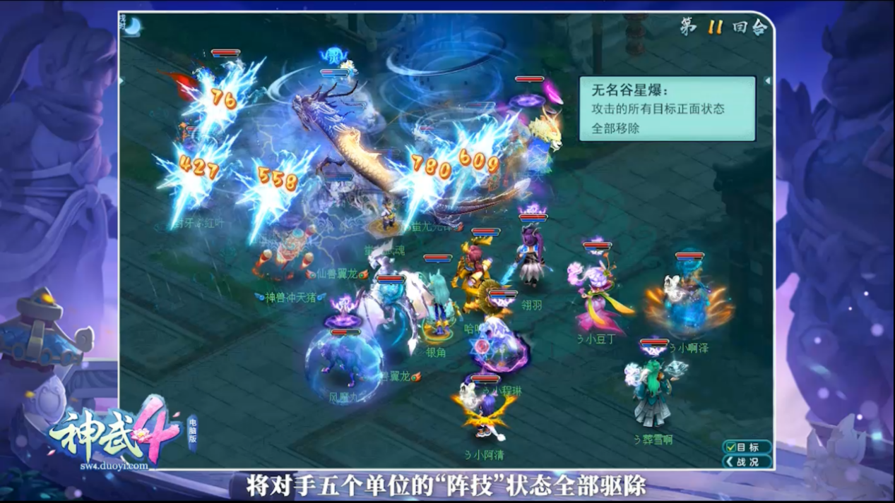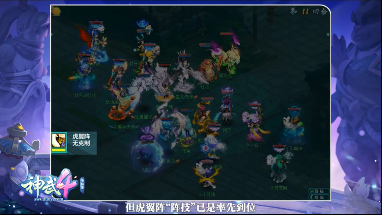 “扬名立万”战队VS“求其啦”战队 比赛第11回合,对战方虽因天宫被点杀而处于被动局面,但虎翼阵“阵技”已是率先到位。如能合理运用阵技,必定一举扭转局势!观战方又能否做出准确预判加以针对?且看双方展开的精彩博弈! 回合正式开始:只见对战方地府率先对观战方无名谷使用“鬼影缠身”。此举意在削减无名谷能量,预判针对其可能释放的“驱散”技能。铺垫已做好,普陀果断开启“阵技”,只待队友输出单位跟进! 然而,观战方见招拆招:地府开启星爆将对手无名谷“嘲讽”,先化解其点杀威胁;随后,处于无宠状态的无名谷并未使用本门派技能,而是以一手星爆配合套装“疾风骤雨”,将对手五个单位的“阵技”状态全部驱除! 这一手星爆+套装实在出乎意料,千算万算,却没算到无名谷还有这样的绝招!当真防不胜防!小伙伴们觉得这“疾风骤雨”套装表现如何? 布局清宠平平无奇?“化险为夷”一箭双雕!