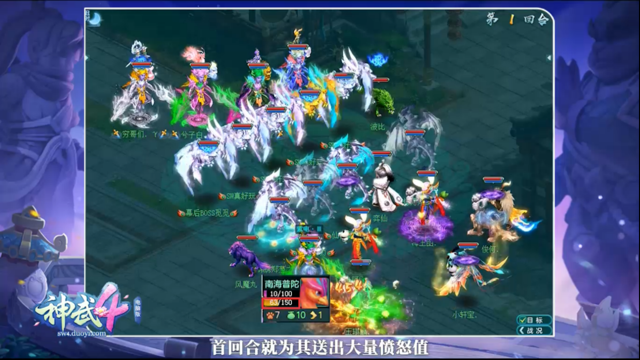 比赛首回合:双方均以高连配群法宠出战。可本该平淡的清宠布局,却因观战方的巧妙战术变得与众不同!下面就一起来欣赏,观战方究竟有何精彩表现! 回合正式开始:观战方天宫做出精准预判,以一手“化险为夷”将天策宠物“隐身”!这是根据对手清宠习惯做出的大胆预判!对战方天策果然中招:因无法攻击到“隐身”目标,这一手横扫天下只能随机命中观战方普陀,首回合就为其送出大量愤怒值! 观战方这一手“化险为夷”既保护了宠物,又令普陀收获愤怒,当真是一举两得!不过这只是开始,观战方的后手才是此战术的精髓:天策宠物配备有化龙鼎技能“潜袭”,待到次回合出手,竟直接打出4000+伤害!将对手接近满血的宠物秒杀! 观战方这一招:“化险为夷”躲横扫,“潜袭击敌”四千伤,真可谓攻守兼备,堪称精妙!可谓教科书级实战奇招! 一回合、两宠、五人、七杀!