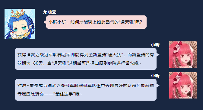 小伙伴们晚上好呀,《神武4》电脑版本届神武之战冠军联赛,淘汰赛明天开赛啦,在之前小昕向小伙伴们介绍了冠军联赛冠军专属坐骑“通天犼”的背景故事。 今天小昕为各位少侠打探到了,关于它更详细的资料哦,接下来就与小昕一起来看看吧! 背景故事: 通天犼勇武无双,幼时与龙族不合,只身力战群龙,终因寡不敌众而落败,奄奄一息之际,被外出巡游的青华大帝救下并带回妙严宫。 与大帝的坐骑九头狮交好,一同侍立于大帝左右多年,大帝虽法力无边,却清心寡欲无凌云之志,并非通天犼最心仪的主人之选。 恰逢贞观盛世,天下群英辈出,通天犼故而辞别大帝降临三界,唯有冠绝群雄身具王霸气息之人,方有幸得通天犼垂青,共谱传奇。 获得方式:获得神武之战冠军联赛冠军即能得到全新坐骑“通天犼”,而新坐骑的有效期为180天,当“通天犼”过期后可选择归厩到庭院进行留念哦~ 欢迎在下方留言讨论,了解更多幻唐志的相关内容请关注 叶子猪幻唐志专区。 [编辑:ssc]