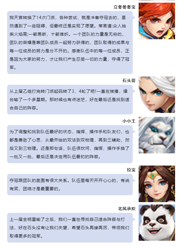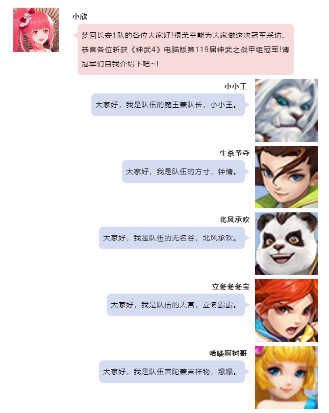 《神武4》第119届神武之战已经圆满落下帷幕,首先让我们恭喜梦回长安1队,拿下本届神武之战甲组的冠军,今天邀请到了他们来接受冠军采访,一起来了解一下吧! 最后小欣还为大家带来了冠军战队的大合影,大家一起来看看吧~ 本届冠军采访到这里就结束了,祝愿大家在以后的神武之战中都能取到好成绩! 欢迎在下方留言讨论,了解更多幻唐志的相关内容请关注 叶子猪幻唐志专区。 [编辑:ssc]