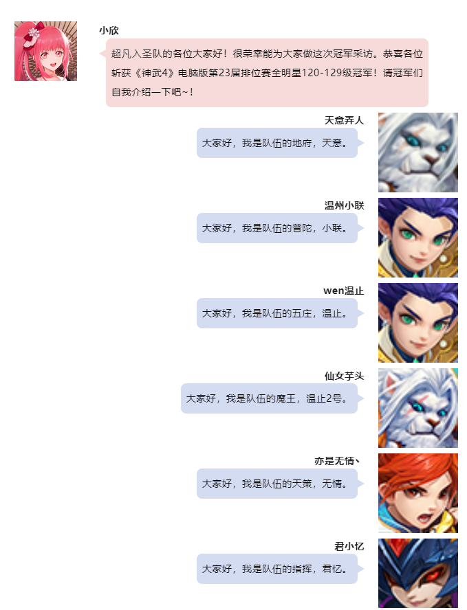 《神武4》本届全明星赛各个等级段的,赛事已经圆满落下帷幕,首先让我们恭喜“超凡入圣”战队,一举摘下本届全明星赛120-129等级段的桂冠! 最后,小欣谨代表广大神武玩家,再次恭喜各位斩获《神武4》电脑版第23届排位赛全明星120-129级冠军!期待各位今后的精彩表现!也感谢大家的积极配合,再会! 欢迎在下方留言讨论,了解更多幻唐志的相关内容请关注 叶子猪幻唐志专区。 [编辑:ssc]