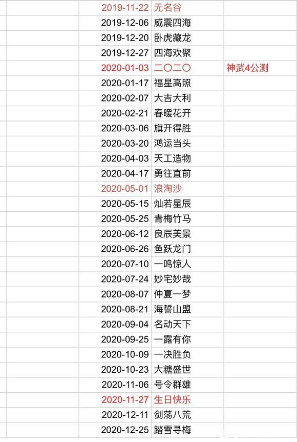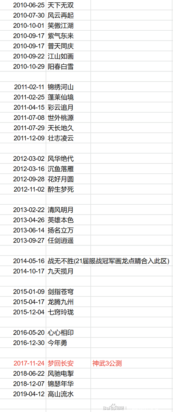 《神武4》附图是 2019年底 到 2021年底,神武所开的服务器汇总。基本就是副本挂机的时候用百度时间限制搜关键字找出来的,当然也有爬虫官网可以直接省去很多时间。 1)当然各个小区最后都会合并,这里可以让大家找到家,万一回归发现区没了可以到临近大区找找。 2)不难发现2020年的区都合得差不多了,只剩下 二零二零,浪淘沙 和 生日快乐了,基本我们也能7788知道策划合区的规律,基本就是每半年整合到一个大区。 3)开区时间的标注,也能让我们看到各个区的实力差距,毕竟二零二零和生日快乐相差10个月了,兽魂凉糕的差距也能在丙组服战上体现。 4)2022年的开区情况,我已经拿着小本本记着了,会在2022年结尾给大家总结。多益, I am watching you! 工作量也不少,希望大家多多评论,你是哪个区清河镇出发的,现在又在哪。 下一段时间挂副本的时候,会统计老区的开区时间,比如天下无双 战无不胜 啦,小区咱们就略过了。这样大家能看到服务器与服务器之间到底差了几年。所以如果有印象的小伙伴,说下老区且还健在的服务器开区时间。楼主可以继续统计2010到2019年的。 适逢今天开新区,我把2022年前5个区再整理贴一下,每次会在下次开新区的时候更新。 总的来看,19年只剩一个高山流水了。18年有2个:风驰电掣和锦瑟年华。17年11月份就是神武3公测了,梦回长安。梦回长安之前,有16年12月份的今年勇和16年5月份的心心相印。 2020前一个区高山流水20219年4月开的,在前一个区锦瑟年华2018年12月开的。在前一个风驰电掣2018年6月开的。在前一个梦回长安2017年11月开的,在前一个今年勇2016年12月开的,在前一个心心相印2016年5月开的。 欢迎在下方留言讨论,了解更多幻唐志的相关内容请关注 叶子猪幻唐志专区。 [编辑:ssc]