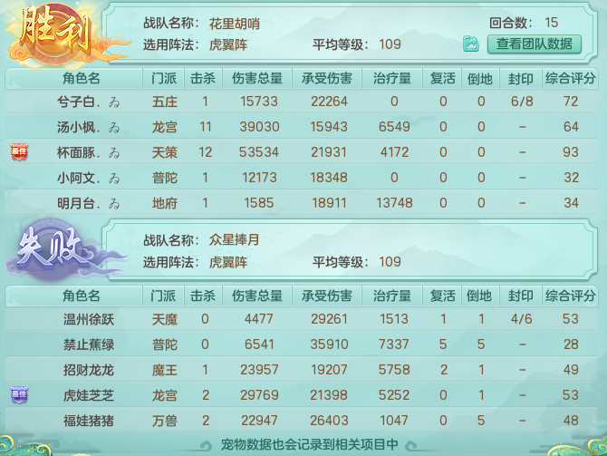《神武4》100-109分组的决赛是“花里胡哨”队对战“众星捧月”队,双方都选择了虎翼阵。“花里胡哨”队三辅助阵容冲刺,15回合便收获胜利! 比赛开局后“花里胡哨”队一改淘汰赛常用的稳健清宠打法,首回合就发动进攻封杀万兽,打了“众星捧月”队一个措手不及。后续的多次守尸和拉环不断限制万兽输出,此消彼长中前排严重失衡。 第7回合“花里胡哨”队将普陀击杀,骤增的恢复压力将“众星捧月”队压垮。“花里胡哨”队用一场精彩的战斗斩获该分组冠军! 阵容分析 阵法 双方都选择了虎翼阵 配置 “花里胡哨”队:五庄+地府+普陀+天策+龙宫(观战方) “众星捧月”队:天魔+普陀+万兽+龙宫+魔王(对战方) 变身卡 观战方: 五庄选择桂花精灵·变异,拥有高级幸运、气血上限+5%的效果; 地府选择文龙·变异,拥有永恒的效果; 普陀选择九色鹿·变异,拥有高级自愈、气血上限+5%的效果; 天策和龙宫选择罗刹女·变异,拥有高级报复、速度-5%的效果。 小欣点评 观战方三辅助放弃抢速,变身卡均以提高生存能力为主,双输出选择报复卡可以有效克制再生,同时根据自身气血比例加伤。 对战方: 天魔选择灵剑仙子·变异,拥有速度+15%、灵力-5%的效果; 普陀选择璃珠·变异,拥有高级再生、速度+20的效果; 万兽选择坐狮·变异,拥有逆击、速度+20的效果; 龙宫选择九头鸟·变异,拥有高级法术波动的效果; 魔王选择罗刹女·变异,拥有高级报复、速度-5%的效果。 小欣点评 对战方封系选择速度卡拿到全场一速,辅助选择再生卡提高续航能力但被报复克制。 首发宠物选择 观战方:2群法+1破碎+1青霜+1盾 对战方:2剑气+1青霜+1高连+1盾 小欣点评 双方在首发的选择上都比较丰富,剑气和群法都可以弥补面伤,青霜单体伤害更高且有几率打出控制,盾宠用于补给状态和吸收伤害,破碎则可以有效克制盾宠。 精彩瞬间 第8回合 对战方万兽“兽神附体”状态仅剩最后一回合,天魔利用速度优势封印观战方五庄保证万兽输出不受干扰。但观战方五庄开启星爆,免疫所有异常状态,“袖里乾坤”出手将对战方万兽封印阻止其出手。 小欣点评 五庄的星爆可以在开启当回合免疫所有异常状态。当速度不够快时,可以通过开启星爆确保自己顺利出手。 第9回合 对战方天魔再次选择利用速度优势封印观战方五庄。但五庄打出“逆转阴阳”提高速率先于天魔出手命中对战方普陀,将对战方丢给普陀的恢复药品全部转移,配合宠物再次将其击杀。 小欣点评 五庄的御魂技能“逆转阴阳”可以120%的速率物理攻击敌人,令目标一定回合内受到的治疗失效,并随机转移给己方目标。用来限制目标恢复有很好的效果,120%的速率能一定程度上弥补速度劣势,确保顺利出手。 第10回合 对战方计划在本回合由三输出配合点杀观战方天策,由于对战方五庄已被封印,对战方天魔为确保万兽可以顺利出手,打出“寒樱似雪”降低地府速度,使万兽可优先出手从而免受地府干扰。 小欣点评 天魔的御魂技能“寒樱似雪”可以使主目标进入“冰霜”状态,降低一定的速度。战斗中可以通过此技能降低敌方单位的速度,使己方单位优先出手。本回合天魔之所以选择“寒樱似雪”并非封印,是因为封印有几率失败,但“寒樱似雪”必定能使主目标减速。 观战方也有预料,五庄打出特技“群体清心”清除地府异常状态,地府速度恢复正常后开启星爆释放“黑暗光环”将对战方万兽嘲讽,“疯狂连击”的伤害全部由地府承受,也使对战方这次点杀以失败告终。 小欣点评 地府的星爆可以显著提高“黑暗光环”的命中率,主目标的命中率更是提高到100%,把握开启时机可完美限制目标输出。 赛后小结 观战方 观战方在开局便激进点杀,通过多次击杀以及地府拉环限制万兽输出,使观战方的前排一直都保持健康的状态。第7回合抓住机会将普陀击杀后,胜利的天平已向观战方倾斜。经过15回合的精彩对决,由观战方收获本届排位赛全明星冠军。 对战方 对战方在开局遭到点杀后,通过召唤盾宠使用药品勉强稳住局面,但第10回合点杀天策未果,普陀频繁被守尸导致本就不乐观的局面雪上加霜。12回合天魔尝试补酒涅槃被击杀也使对战方失去最后的翻盘机会,遗憾收场。 欢迎在下方留言讨论,了解更多幻唐志的相关内容请关注 叶子猪幻唐志专区。 [编辑:ssc]