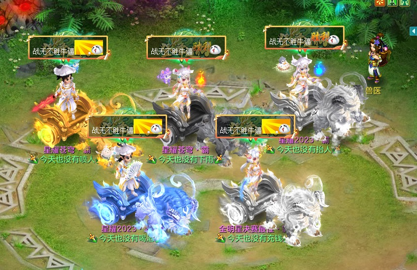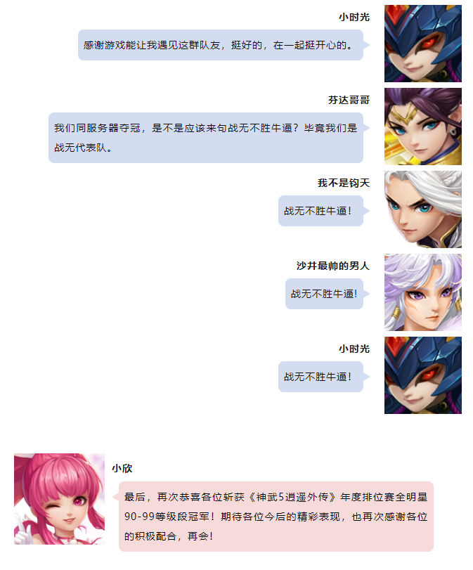 《神武5》年度排位赛全明星各个等级段的赛事已经圆满落下帷幕,首先让我们恭喜“给你搓背”战队一举摘下年度排位赛全明星90-99等级段的桂冠! 90-99等级段冠军“给你搓背”队 本次采访的团队成员有: 无量浩然(浩然哥哥) 天宫芬达(芬达哥哥) 盘丝(沙井最帅的男人) 无名然一(然一哥哥) 魔王(小时光) 除此之外还有: 指挥云天(我不是钧天) 风云再起的蜜桔(ppxh小海) 乌兹(我是乌兹) 爆炸哥 欢迎在下方留言讨论,了解更多幻唐志的相关内容请关注 叶子猪幻唐志专区。 [编辑:ssc]