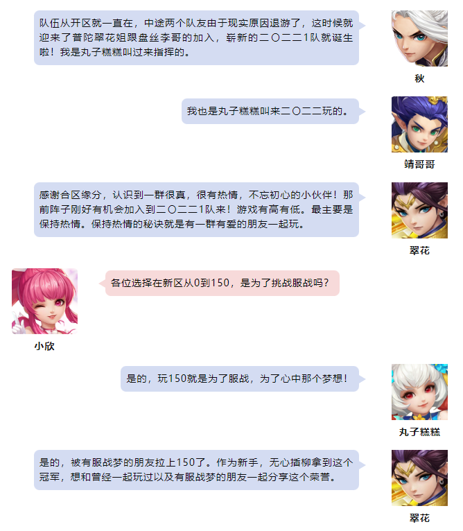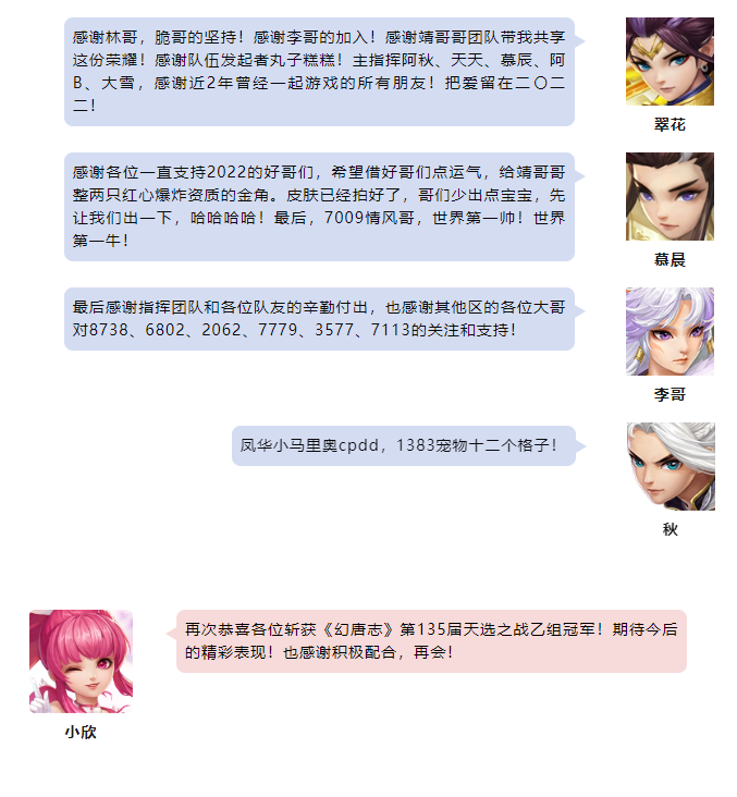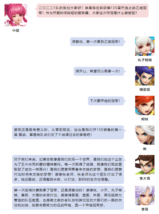 《幻唐志》本届天选之战各个分组的赛事已经圆满落下帷幕,首先让我们恭喜“二〇二二1”队一举摘下本届天选之战乙组的桂冠! 第135届天选之战乙组冠军 二〇二二1队 本次采访的团队成员有: 无名—阿林 天宫—靖哥哥 喜欢自己上场的盘丝—李哥 普陀—翠花 鬼谷—你挺嗨啊 除此之外还有: 指挥-秋 丸子糕糕 小天 李大雪 靖哥哥头号粉丝-慕晨 欢迎在下方留言讨论,了解更多幻唐志的相关内容请关注 叶子猪幻唐志专区。 [编辑:ssc]