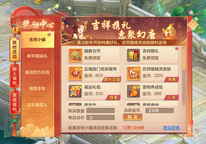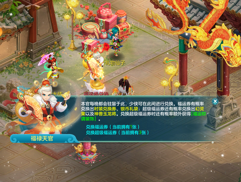《幻唐志》瑞雪丰年,幻唐迎新!瑞雪迎新系列活动火热进行中,快来三界一起玩耍吧! 玉龙逐影 龙年神兽玉龙将在长安城为三界少侠准备了全新的挑战活动,每层关卡会提供各种各样的特性,大家合理地利用特性的效果,能使战斗事半功倍。 随着层数的提高,难度也逐步提升,而通过之前挑战获得积分,可以兑换技能卡片,能让大家在中获得增益,战胜更强大的敌人勇攀高峰!少侠快拉上小伙伴们,一起通关吧! 福禄天官 寓意着福气和好运的福禄天官将随机下凡到长安城某个地方,为大家带来好寓意。寻找到福禄天官的少侠们,可以使用福运券与他兑换新年礼物。据说,福禄天官的新年礼物里还有幻灵果等惊喜大奖,少侠们不要错过哦! 吉祥小铺 携礼而来,吉祥小铺再度开启!本次除了新上架的“五福临门名称装饰”外,吉祥还给大家带来了大家期待已久的“后羿猫精灵皮肤”,想要把后羿猫带回家的少侠们,记得留意啦! 元旦大服“二〇二四”现已开启,瑞雪迎春系列活动已上线,更多精彩内容现在登录游戏即可体验! 欢迎在下方留言讨论,了解更多幻唐志的相关内容请关注 叶子猪幻唐志专区。 [编辑:ssc]