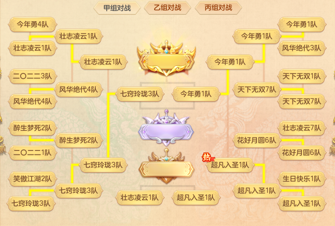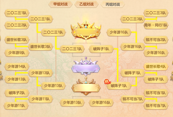 《幻唐志》第141届天选之战总决赛将于今晚打响,20:15相约天选真君一起欣赏各服务器代表队带来的视觉盛宴吧! 天选之战甲组对战表 七窍玲珑3队 对战 今年勇1队 双方阵容 天选之战乙组对战表 锦绣河山5队 对战 风华绝代11队 双方阵容 天选之战丙组对战表 二〇二三1队 对战 破阵子1队 双方阵容 总决赛将在今晚20:15开始,大家记得前往各主城天选真君处为自己喜爱的队伍加油助威啦! 欢迎在下方留言讨论,了解更多幻唐志的相关内容请关注 叶子猪幻唐志专区。 [编辑:ssc]
