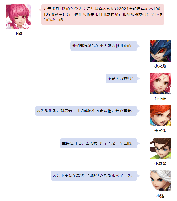 《幻唐志》2024全明星年度赛各个分组的赛事已经圆满落下帷幕,首先让我们恭喜“九天揽月1”队一举摘下本届全明星年度赛100-109级分组的桂冠! 2024全明星年度赛 100-109分组冠军 九天揽月1队 本次采访的团队成员有: 天策-军师小皮戈 方寸-主教练苏小静 无量-指挥佛系佳 魔王-默知意 地府-日常指挥小火龙 除此之外还有: 指挥小潘 本届冠军采访到这里就结束了,祝愿大家在以后的赛事中都能取到好成绩! 欢迎在下方留言讨论,了解更多幻唐志的相关内容请关注 叶子猪幻唐志专区。 [编辑:ssc]