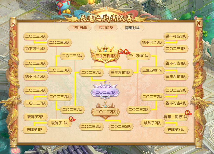 《幻唐志》第142届天选之战各分组的赛事已经圆满落下帷幕,让我们一起来看下这届比赛的情况吧! 甲组对决 在甲组的决赛中,“超凡入圣1”队与“今年勇1”队展开了一场矛与盾的大战,最终“超凡入圣1”队凭借双五庄出色的防守,成功将比赛拖入后期击败对手,取得了比赛的胜利! 值得一提的是,“超凡入圣1”队在本月开赛的2024全明星年度赛中,拿到了130-150级分组冠军,实现全明星和天选之战的双赛事冠军,让我们恭喜他们! 乙组对决 “浪淘沙5”队与“普天同庆8”队在乙组决赛中同样上演了一场矛与盾的大战,不同的是,本场比赛由三输出的“浪淘沙5”队成功击穿对手三辅助的防守,赢下乙组冠军。 丙组对决 丙组决赛“三生万物1”队与“二〇二三7”队的三输出对攻大战同样精彩,“三生万物1”队凭借双物理强大的集火能力屡屡击倒对方单位,最终以一场39回合的精彩战斗,赢下本场比赛胜利。 在这届比赛中,一些顶尖选手凭借出色表现登上了各项数据统计的巅峰,想要了解更多本届赛事详情可关注我们后续报道! 欢迎在下方留言讨论,了解更多幻唐志的相关内容请关注 叶子猪幻唐志专区。 [编辑:ssc]